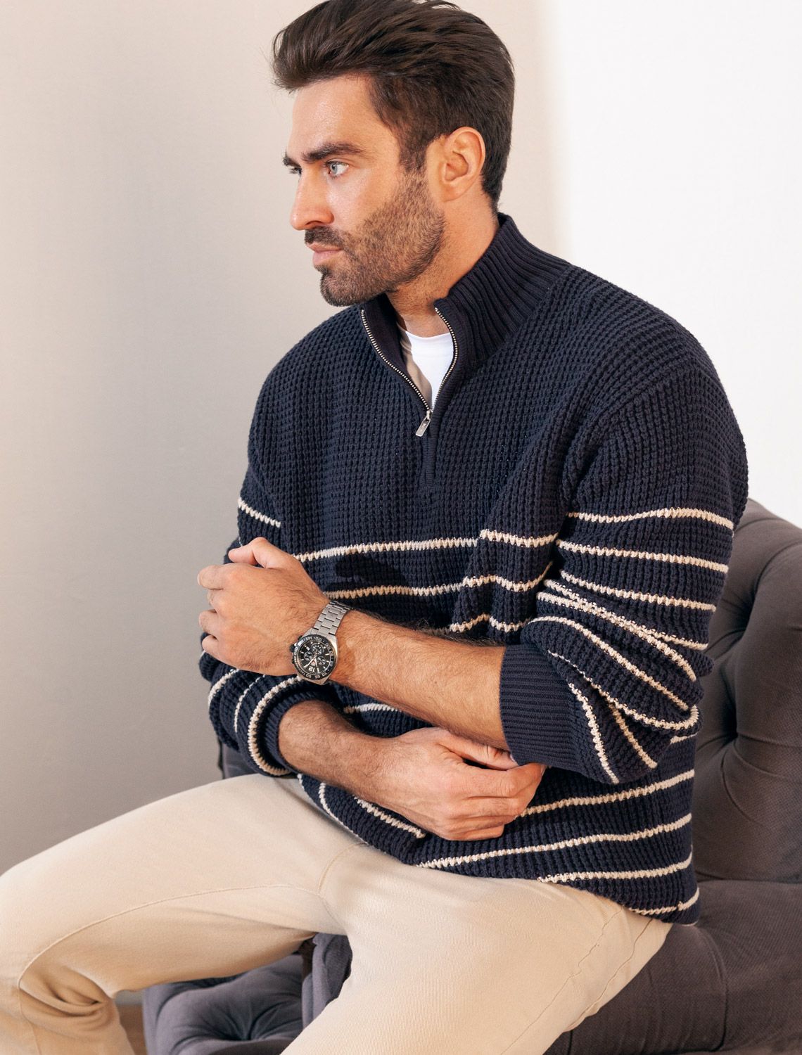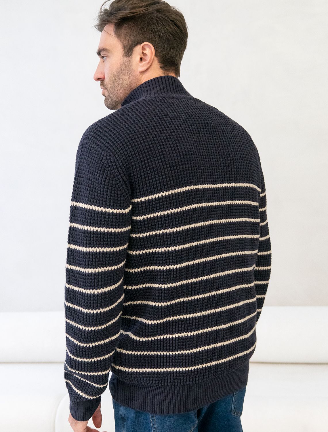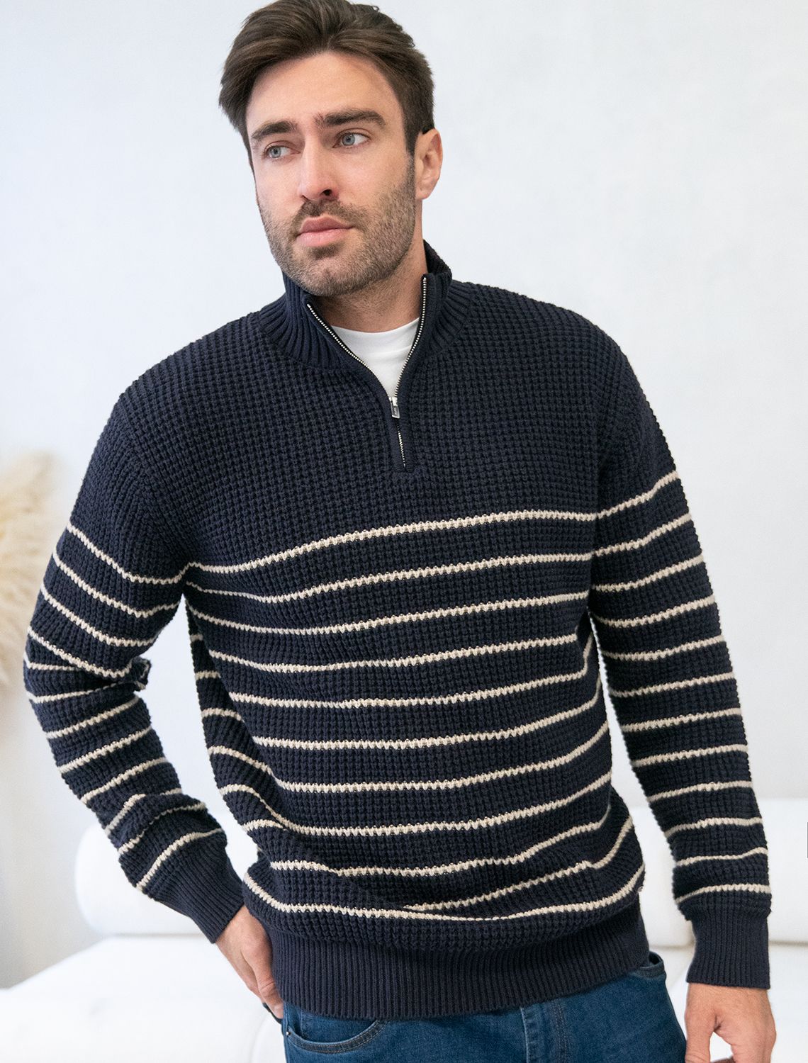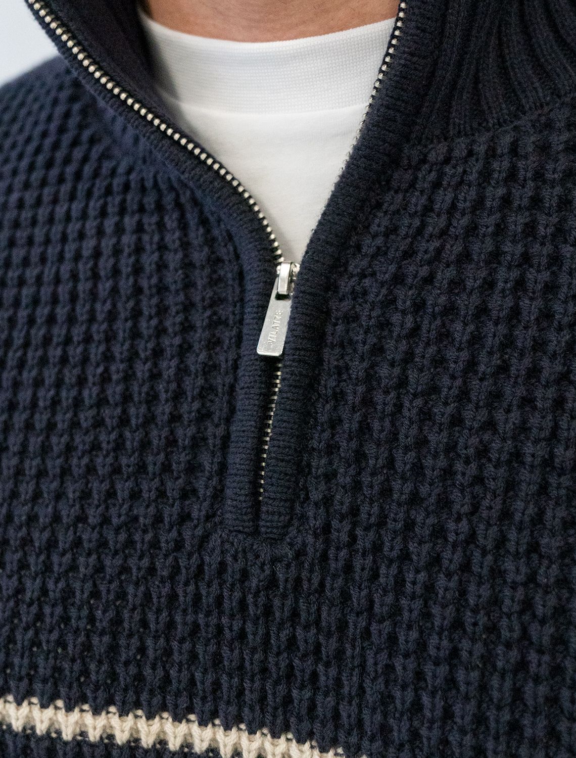 Свитер фактурной крупной вязки с металлической молнией U39.009 темно-синий