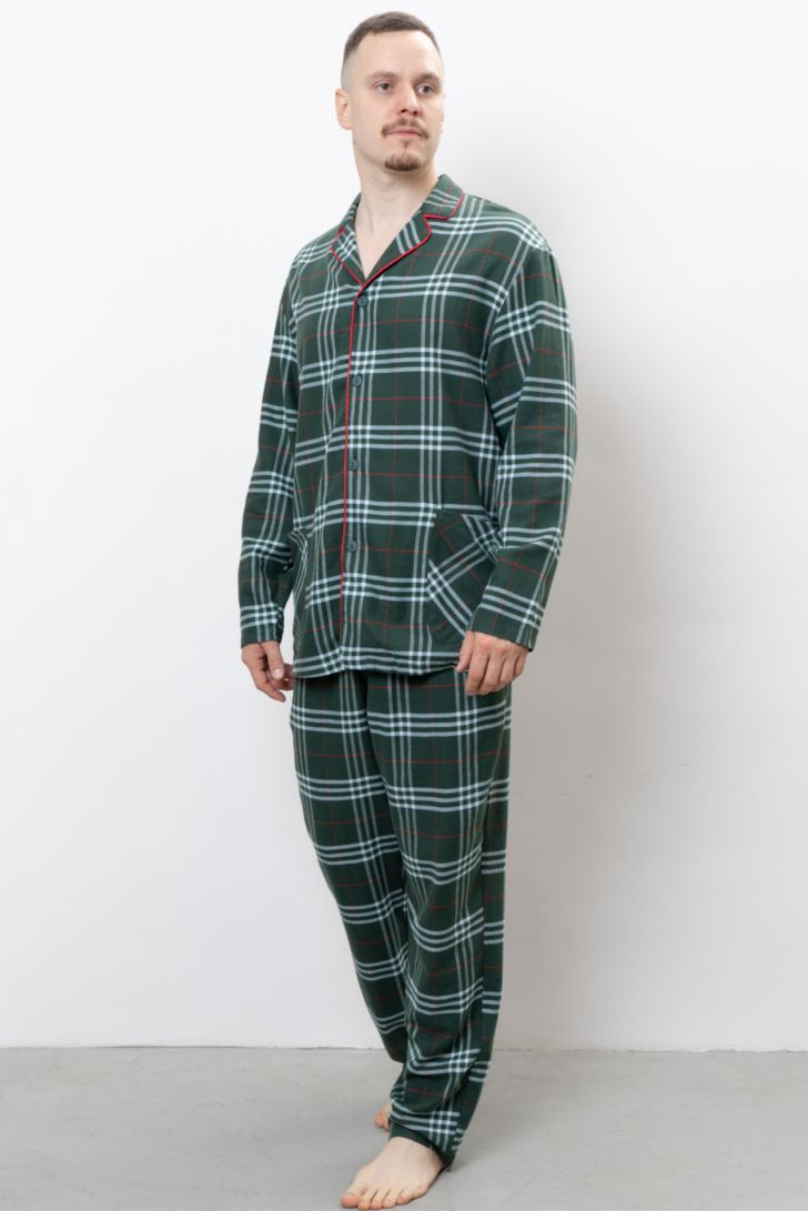 Пижама мужская состоит из рубашки на пуговицах и брюк свободного прилегания. Рубашка декорирована накладными карманами и контрастным кантом.