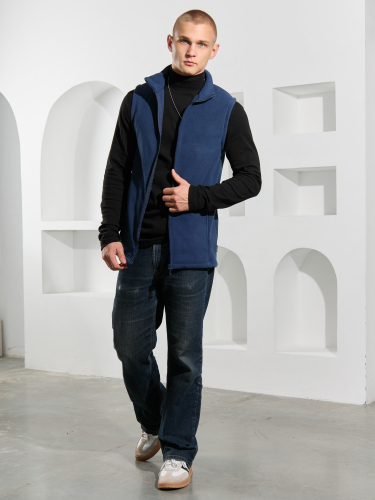 Жилет мужской из флиса, прилегающего силуэта, с воротником-стойкой , центральной боротовой застежкой на тесьму "молния" и вертикальными рельефами на полочках, в швах которых обработаны карманы. Проймы и низ изделия обработаны подгибкой. В нижней части левого бокового шва вставлен небольшой декоративный элемент из репсовой ленты.