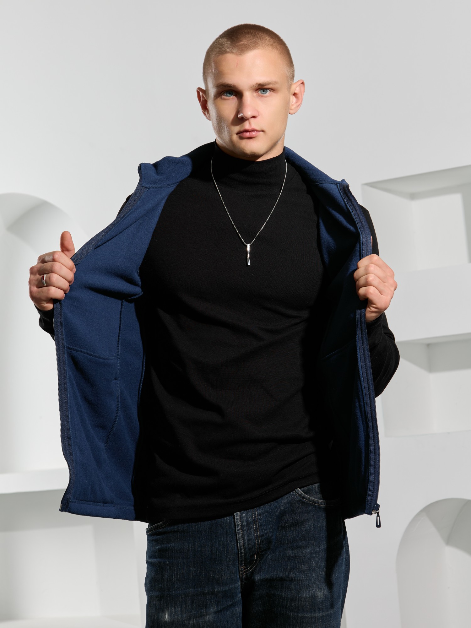 Жилет мужской из флиса, прилегающего силуэта, с воротником-стойкой , центральной боротовой застежкой на тесьму "молния" и вертикальными рельефами на полочках, в швах которых обработаны карманы. Проймы и низ изделия обработаны подгибкой. В нижней части левого бокового шва вставлен небольшой декоративный элемент из репсовой ленты.