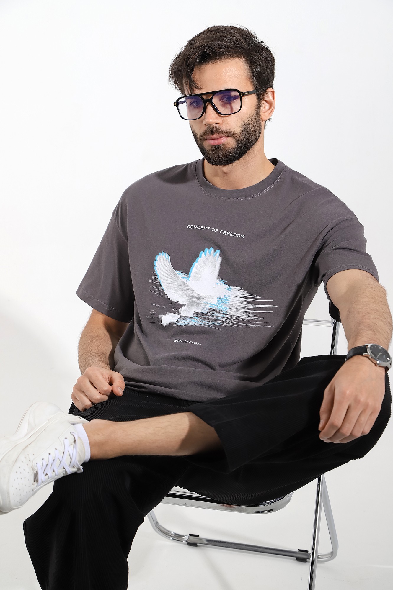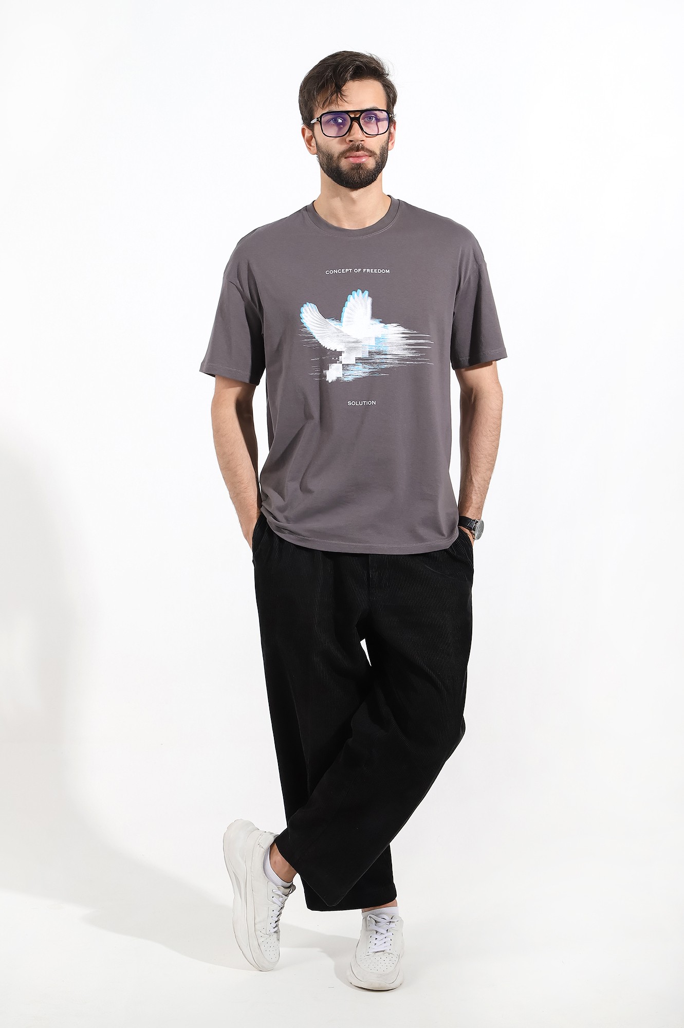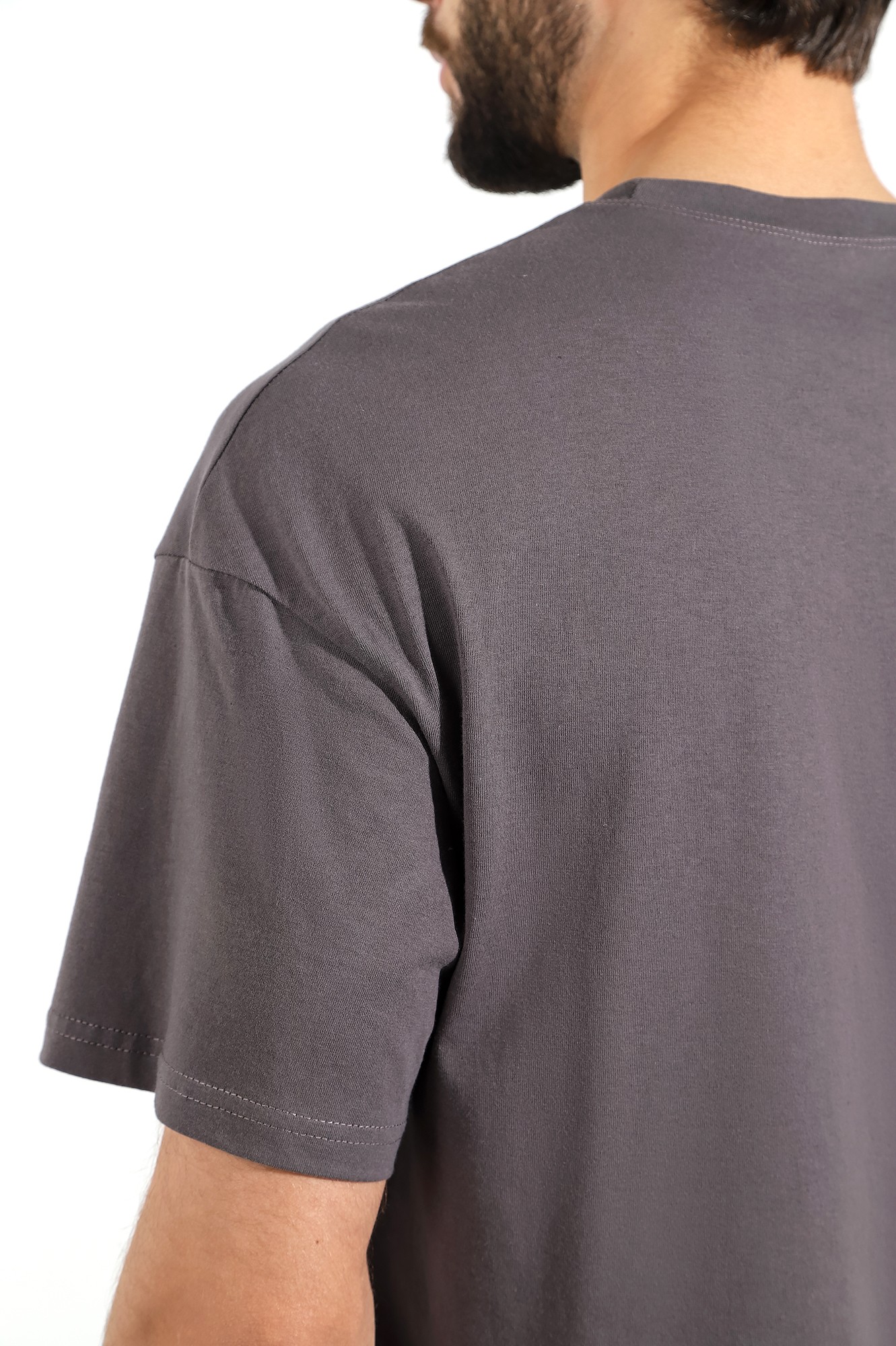 Футболка мужская из гладкокрашеного трикотажного полотна "кулирка", свободного покроя, со спущенным плечом и втачными короткими рукавами. Горловина овальной формы обработана втачной планкой. По шву втачивания планки настрочена двойная отделочная строчка. В центре переда - принт, выплненный в технике шелкографии.