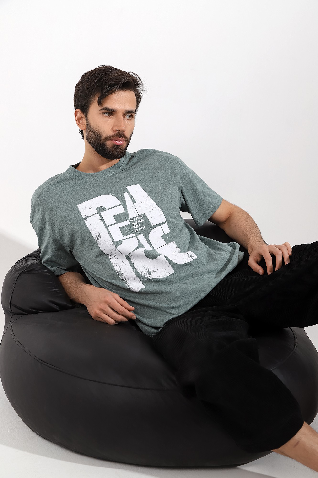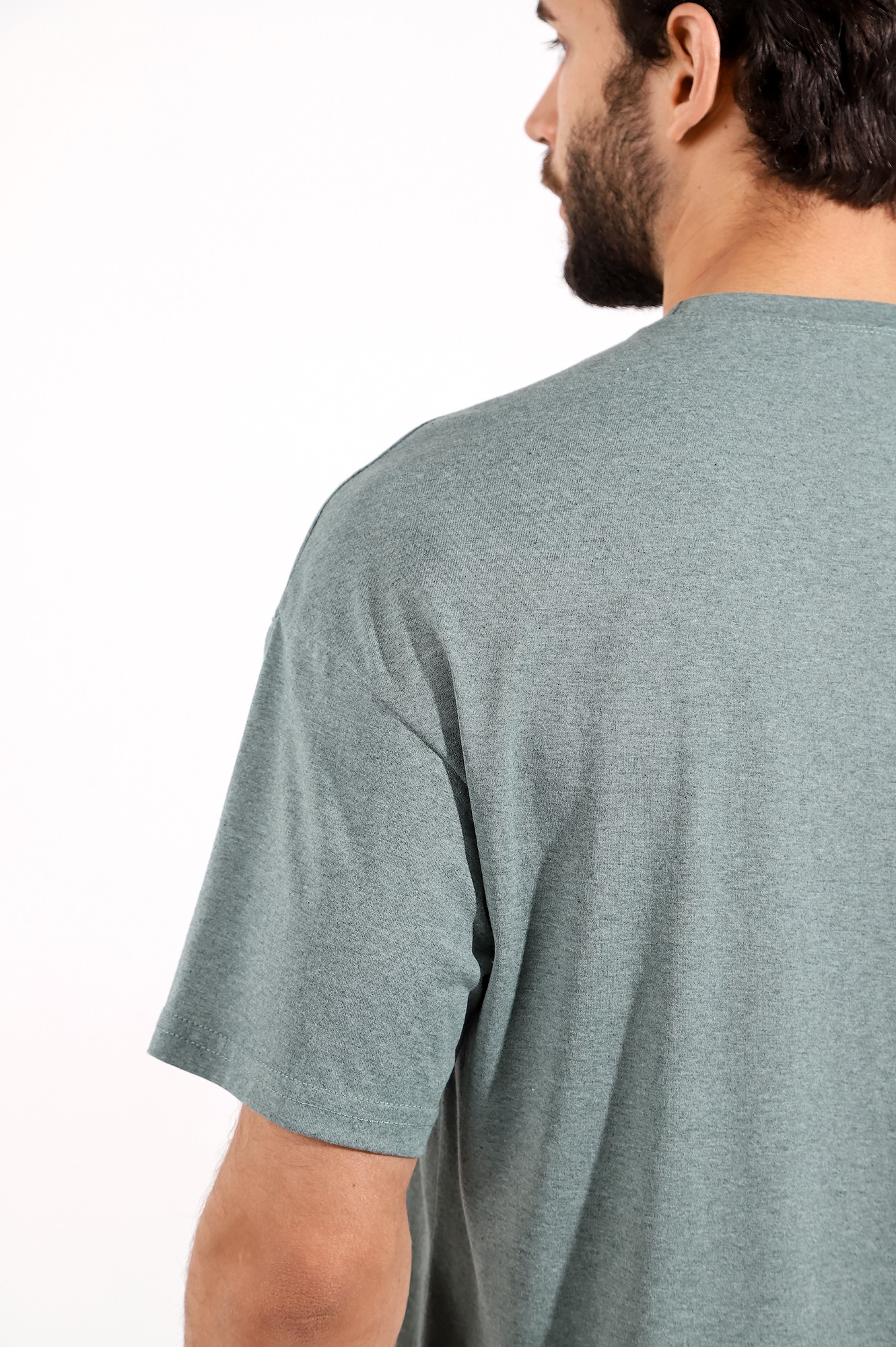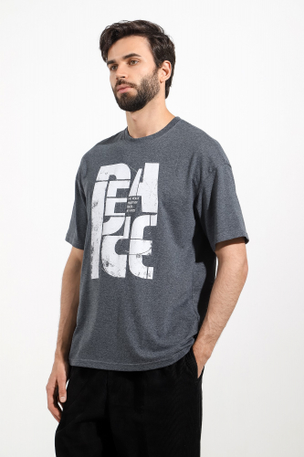 Футболка мужская из меланжированного трикотажного полотна "кулирка", свободного покроя, со спущенным плечом и втачными короткими рукавами. Горловина овальной формы обработана втачной планкой. По шву втачивания планки настрочена двойная отделочная строчка. В центре переда - принт, выплненный в технике шелкографии.