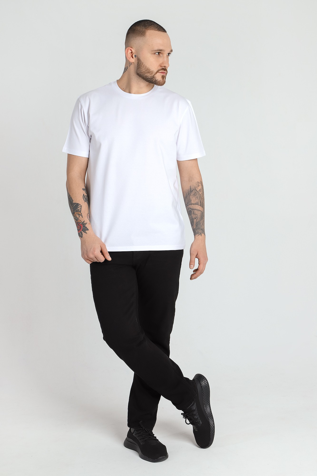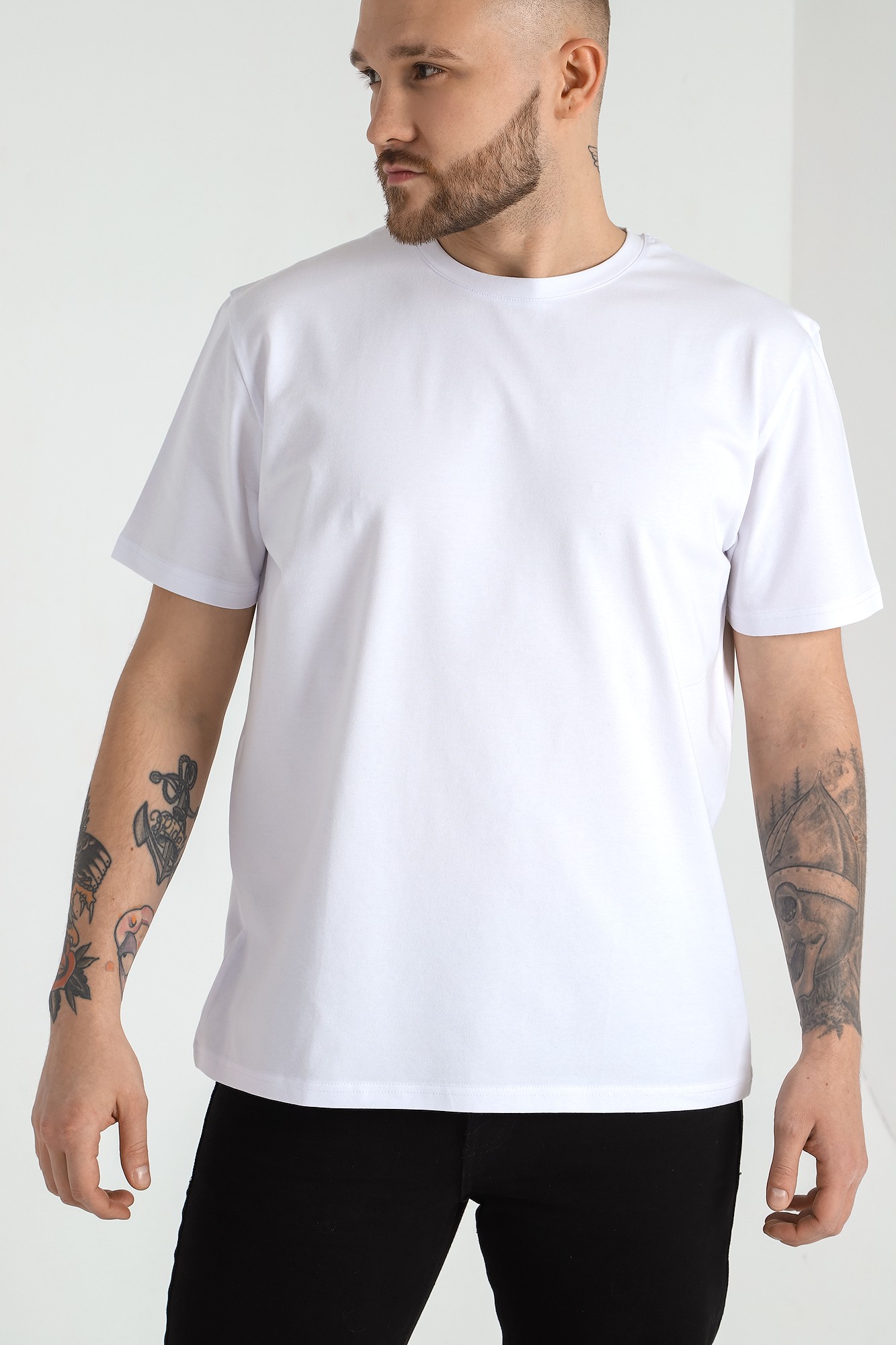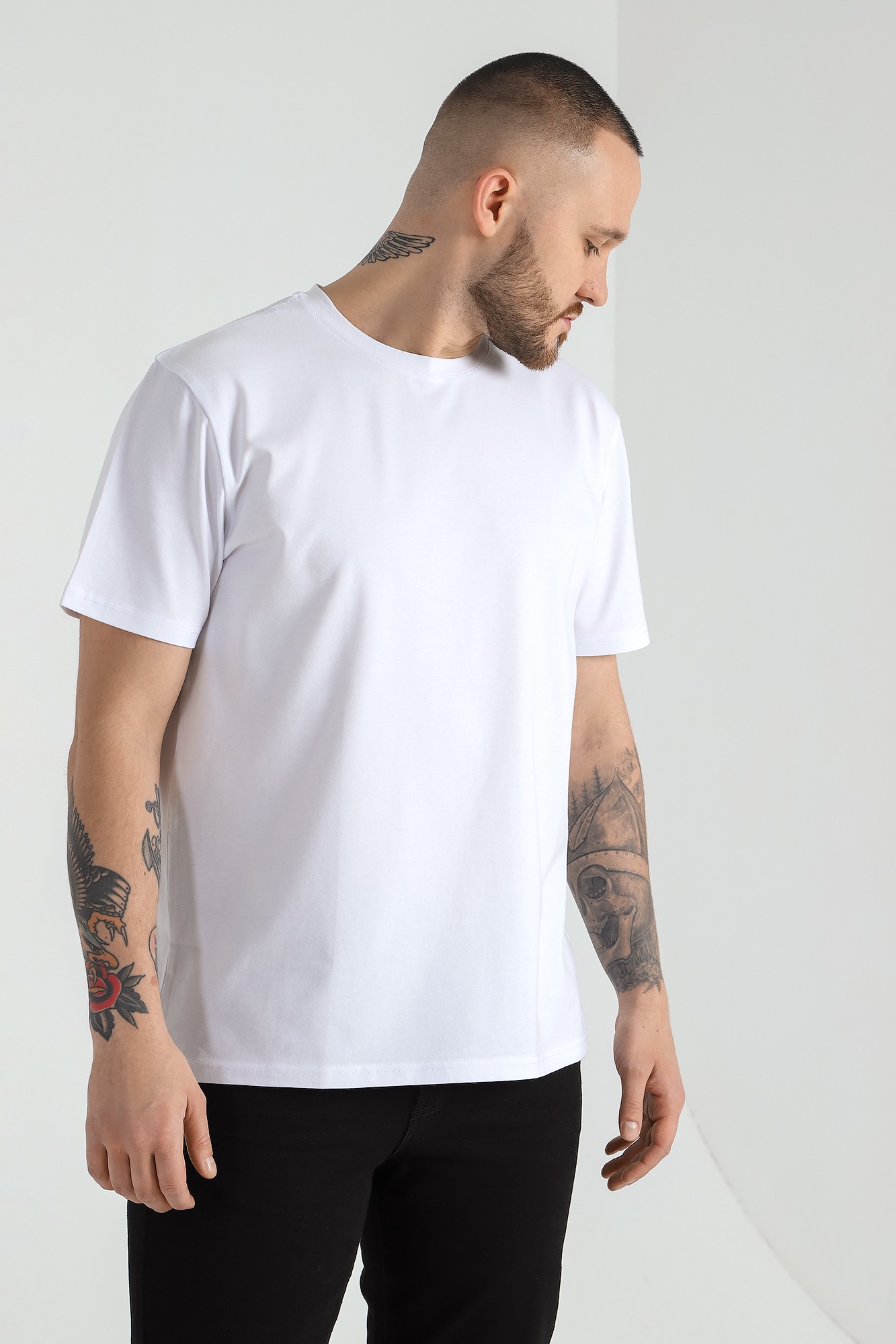 Базовая однотонная мужская футболка прямого силуэта без принта. Выполнена из трикотажного полотна: хлопкового с добавлением лайкры. Горловина округлой формы с усилителем горловины спинки.