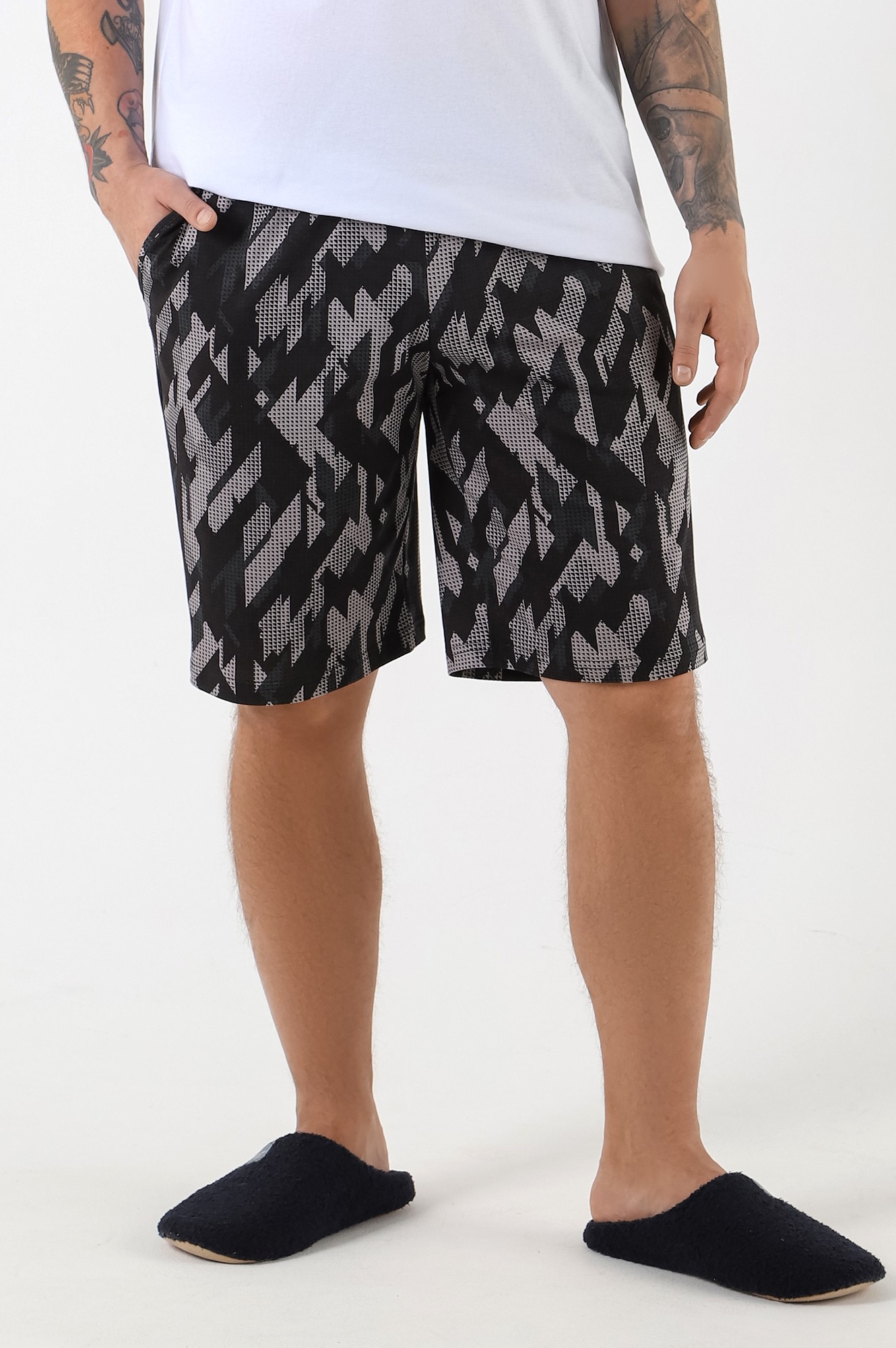 Шорты мужские из трикотажного полотна "кулирка" с набивным рисунком, удлиненные, на притачном поясе с эластичной тесьмой внутри, с карманами в боковых швах, входы в которые окантованы основным материалом.