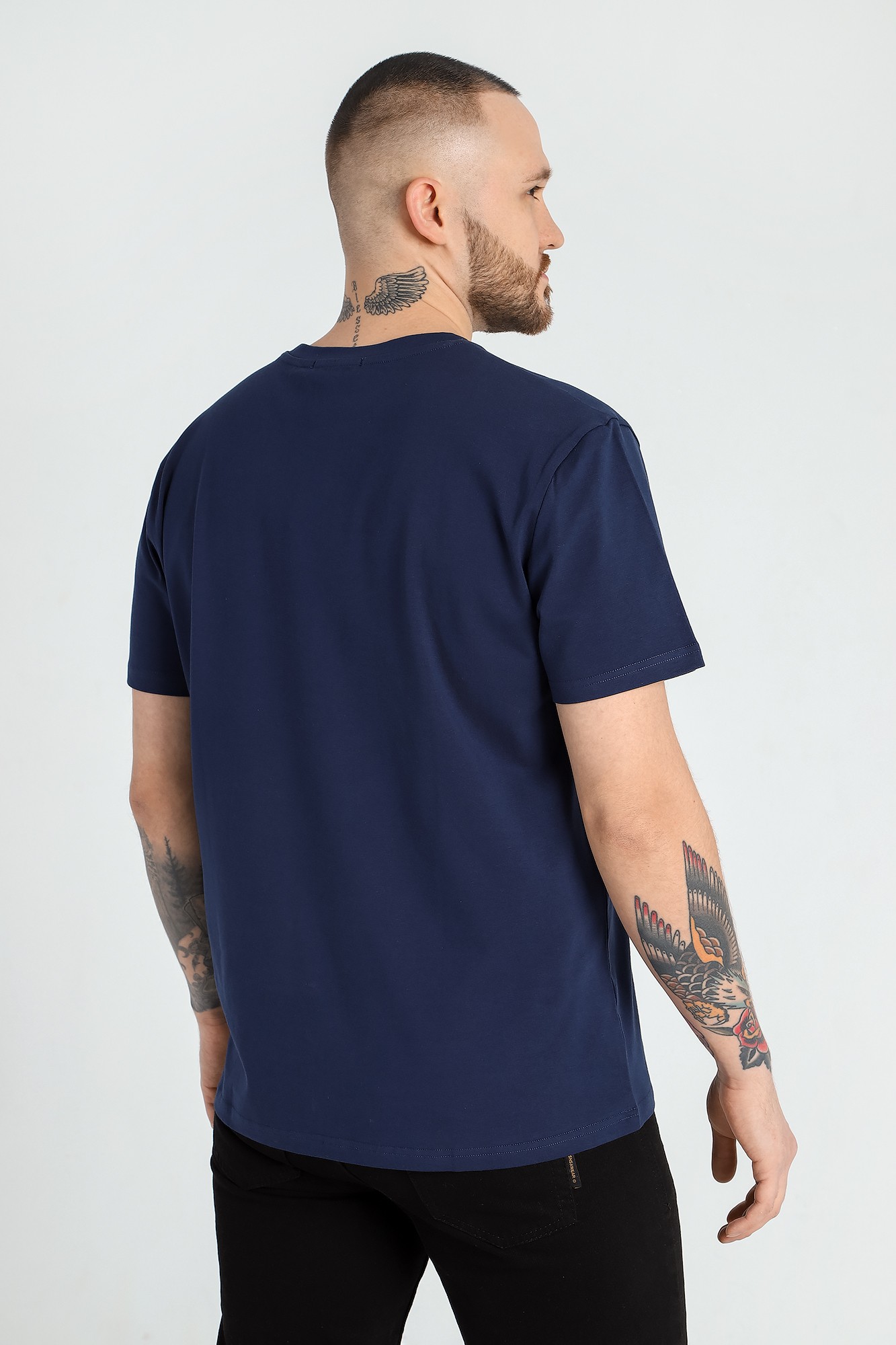 Футболка мужская из гладкокрашеного трикотажного полотна "кулирка" с лайкрой, классическогоь покроя, с коротким втачными рукавами, горловиной овальной формы, обработанной втачной планкой и принтом на полочке, выполненным в технике шелкографии.