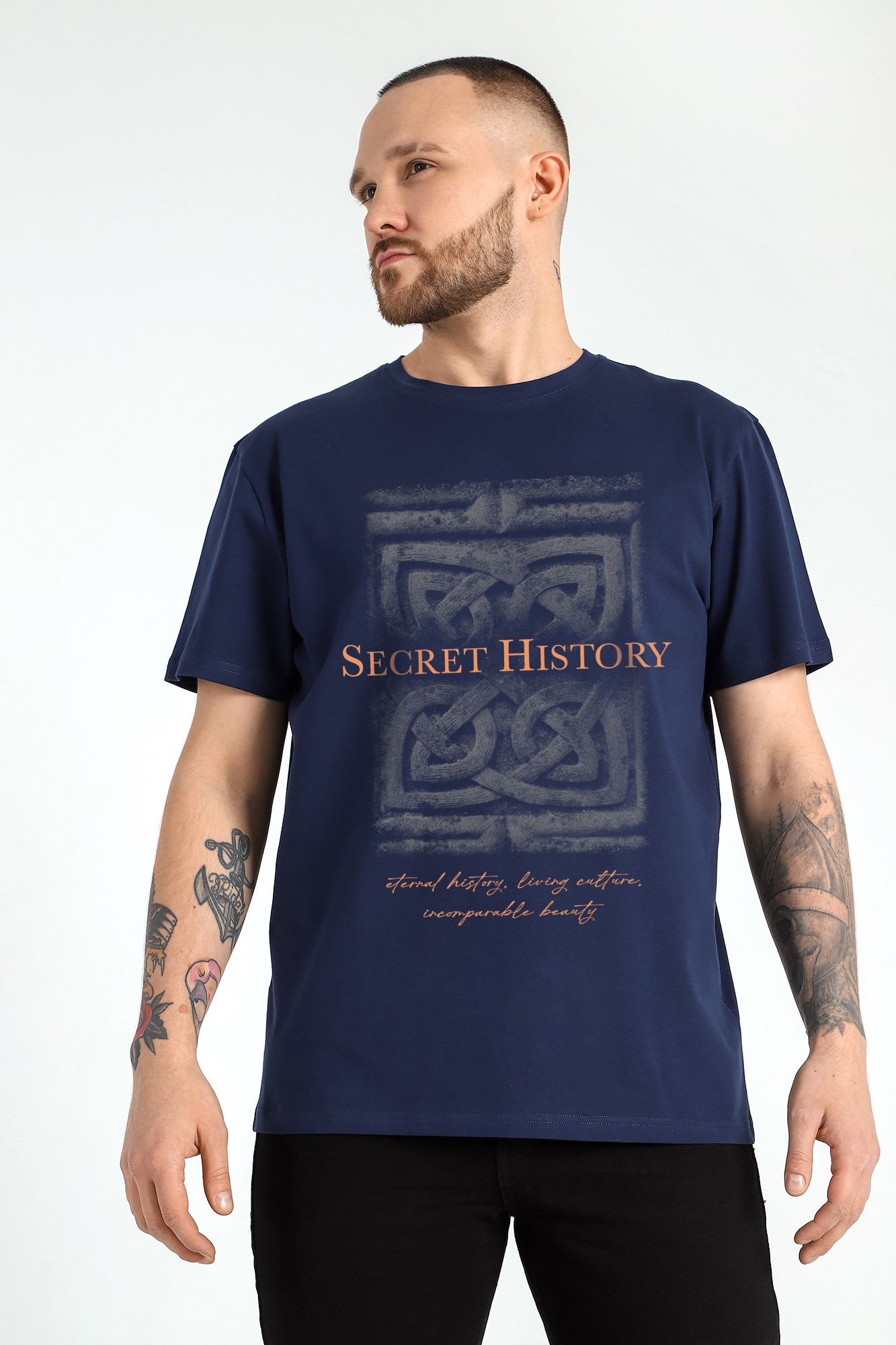 Футболка мужская из гладкокрашеного трикотажного полотна "кулирка" с лайкрой, классическогоь покроя, с коротким втачными рукавами, горловиной овальной формы, обработанной втачной планкой и принтом на полочке, выполненным в технике шелкографии.