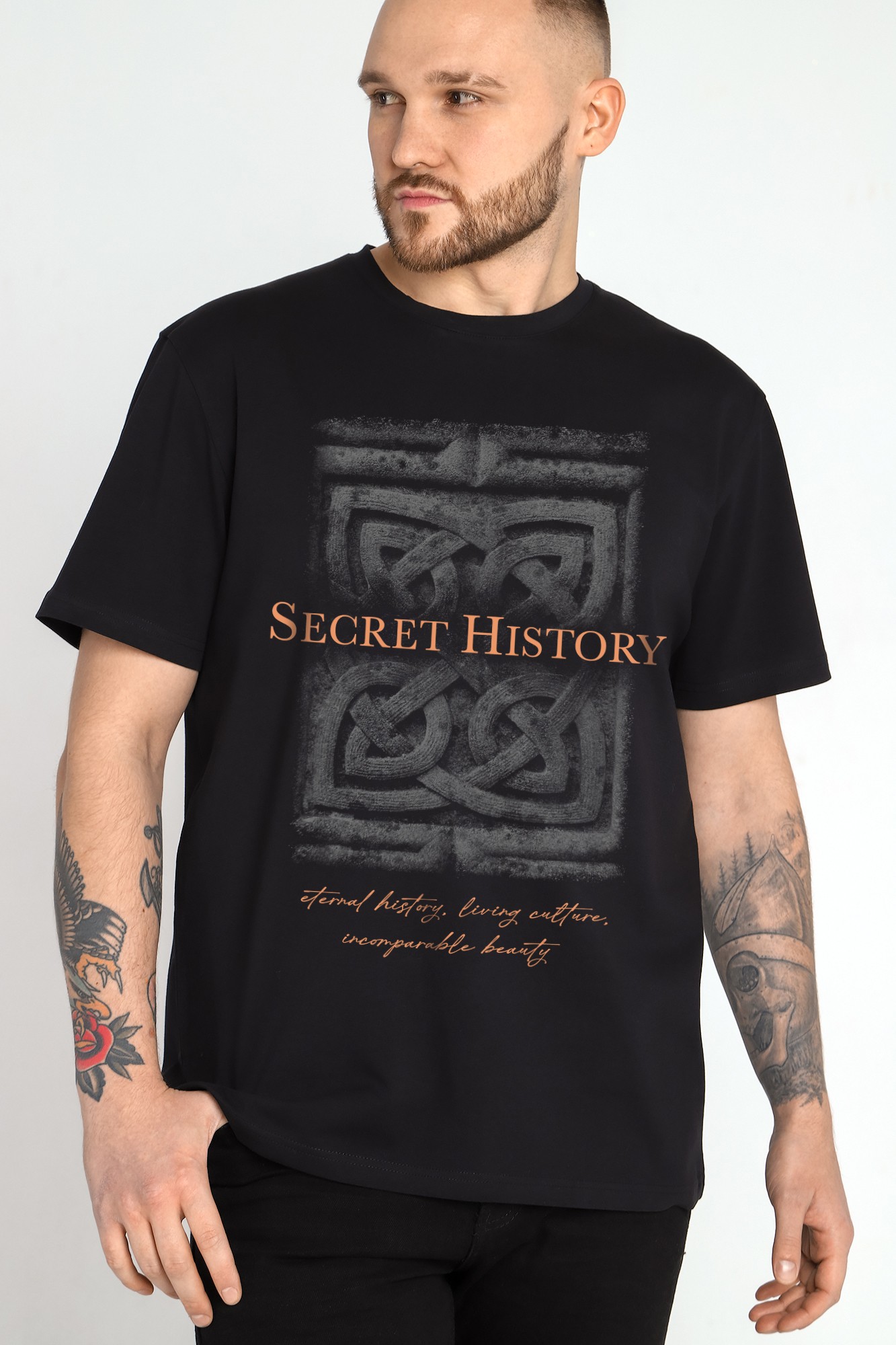 Футболка мужская из гладкокрашеного трикотажного полотна "кулирка" с лайкрой, классическогоь покроя, с коротким втачными рукавами, горловиной овальной формы, обработанной втачной планкой и принтом на полочке, выполненным в технике шелкографии.