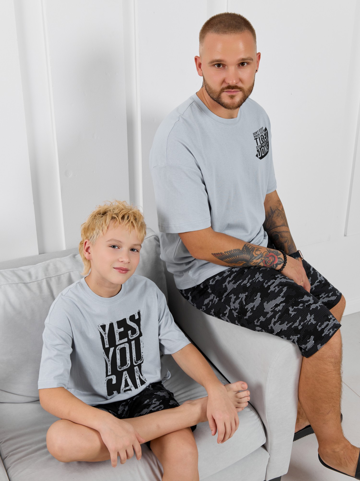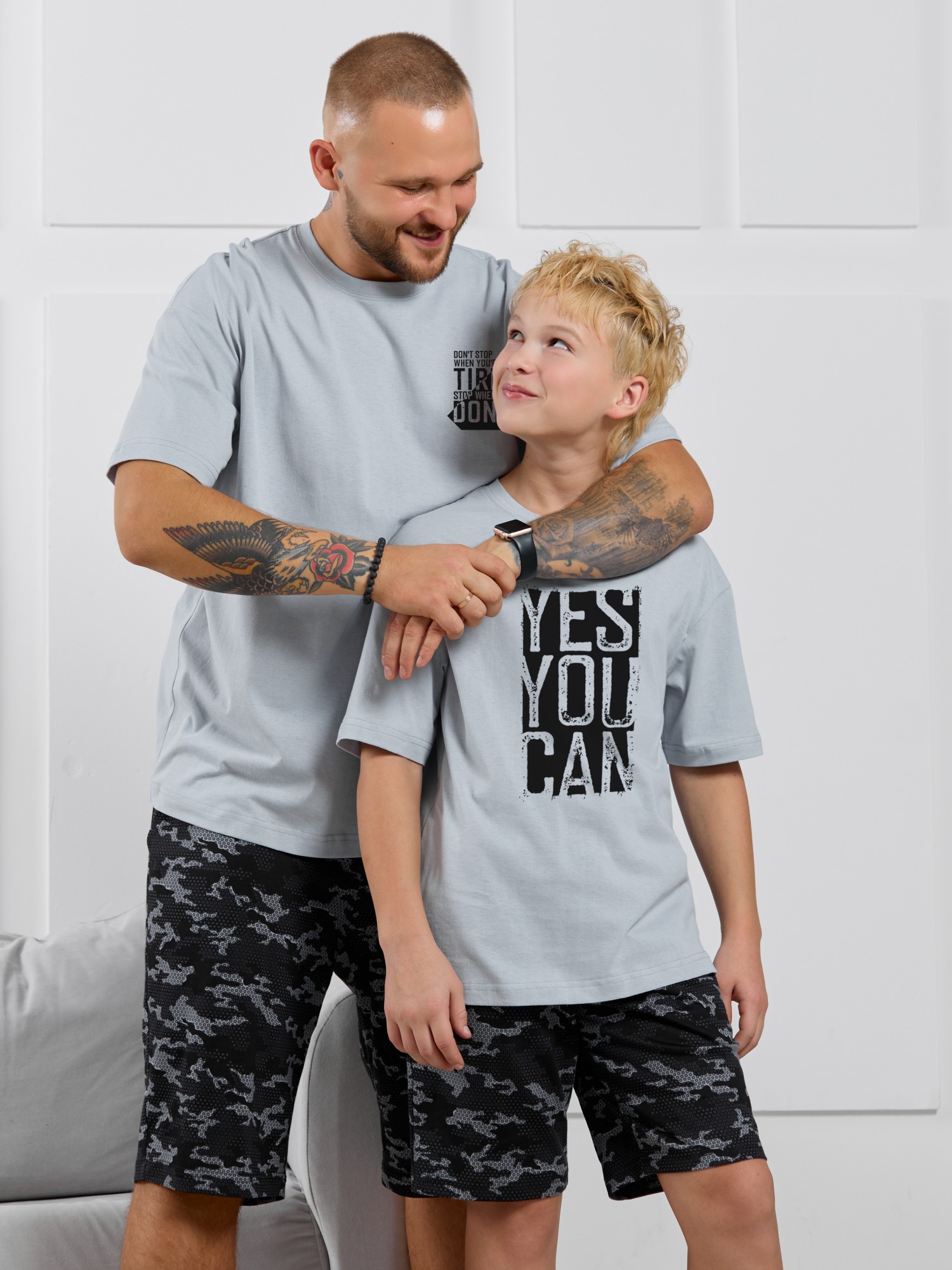 Костюм для мальчика, состоящий из футболки и шорт. Футболка однотонная с принтом на груди; модель свободная, со спущенной линией плеч. Шорты из полотна с набивным рисунком эксклюзивного дизайна, с боковыми карманами с обтачными входами, на притачном поясе с отстроченной эластичной тесьмой.