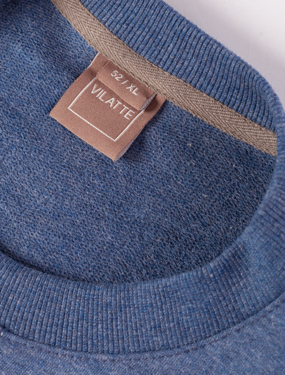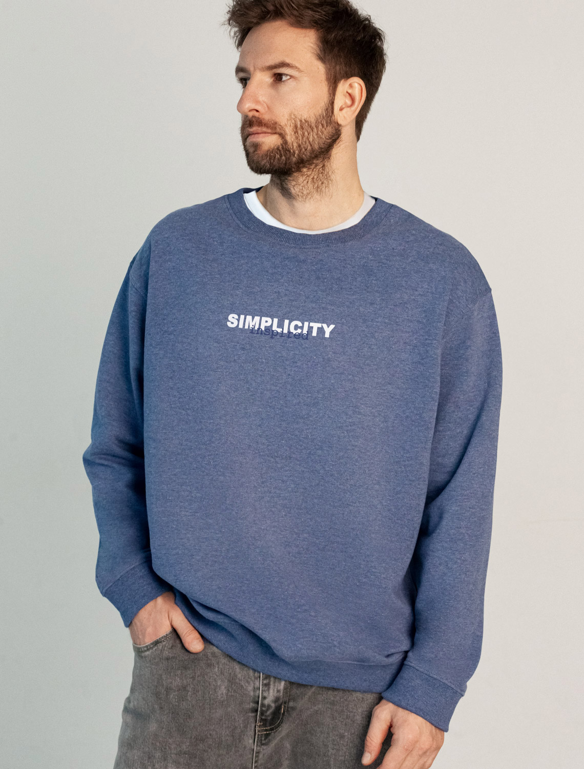 Свитшот выполнен из эластичного футера трехнитки-петля. Авторский принт нанесен фактурными красками с устойчивым покрытием. Перевод: Simplicity inspires - вдохновляясь простотой. Мягкая и очень удобная модель, не сковывающая движений, идеально подойдет для повседневного аутфита. Внизу изделия нашивка из эко-кожи с логотипом бренда. синий меланж