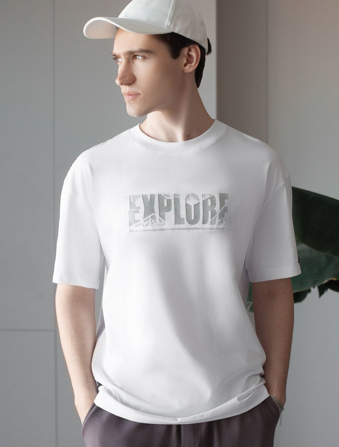 Перевод принта: Explore the great outdoors - исследуй мир. Футболка свободного кроя выполнена из премиального хлопка. Авторский принт нанесен красками с устойчивым покрытием. Благодаря эластану, носить изделие очень комфортно, и оно сохранит свой безупречный вид в течение долгого времени. На рукаве нашивка из эко-кожи с логотипом бренда.