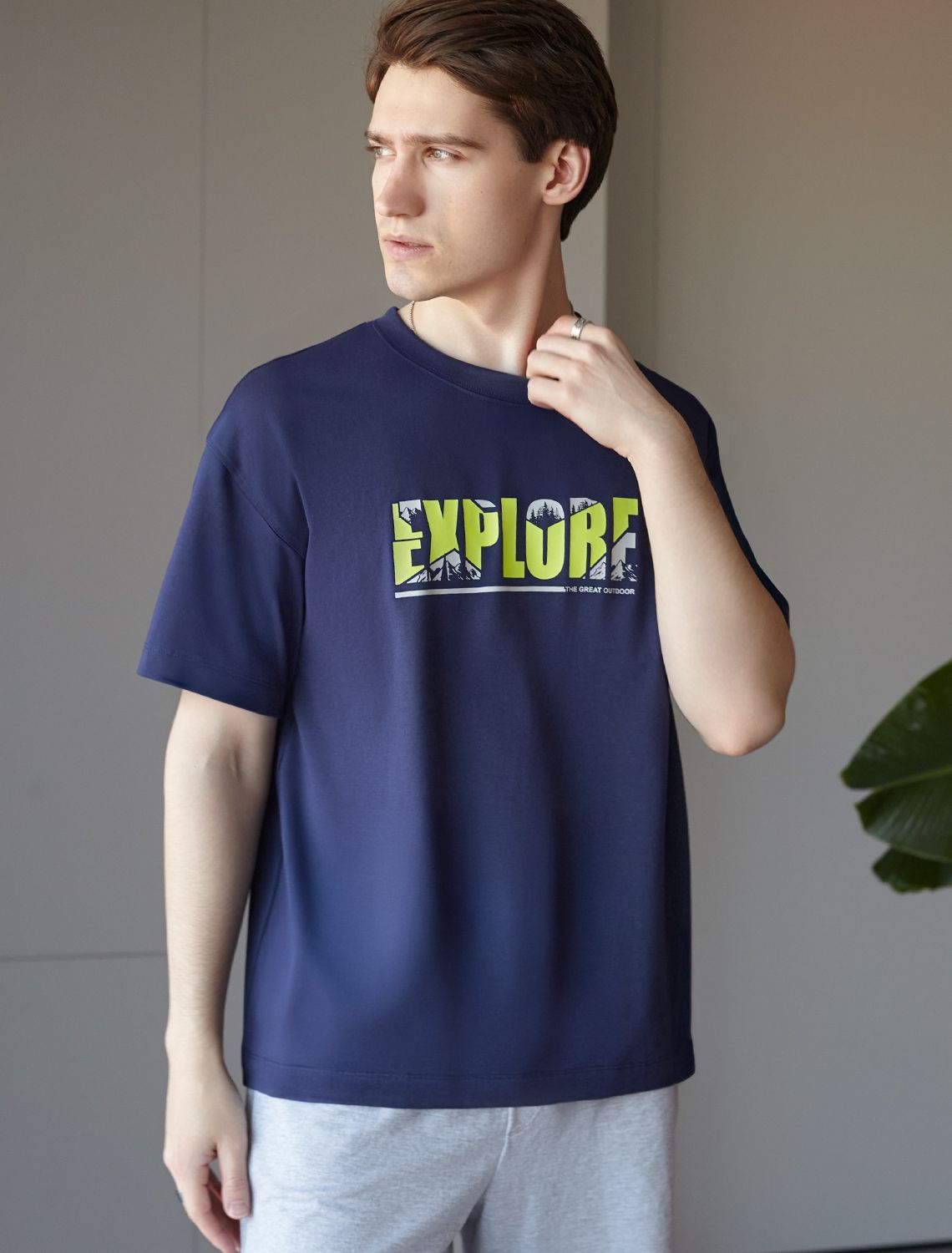 Перевод принта: Explore the great outdoors - исследуй мир. Футболка свободного кроя выполнена из премиального хлопка. Авторский принт нанесен красками с устойчивым покрытием. Благодаря эластану, носить изделие очень комфортно, и оно сохранит свой безупречный вид в течение долгого времени. На рукаве нашивка из эко-кожи с логотипом бренда.