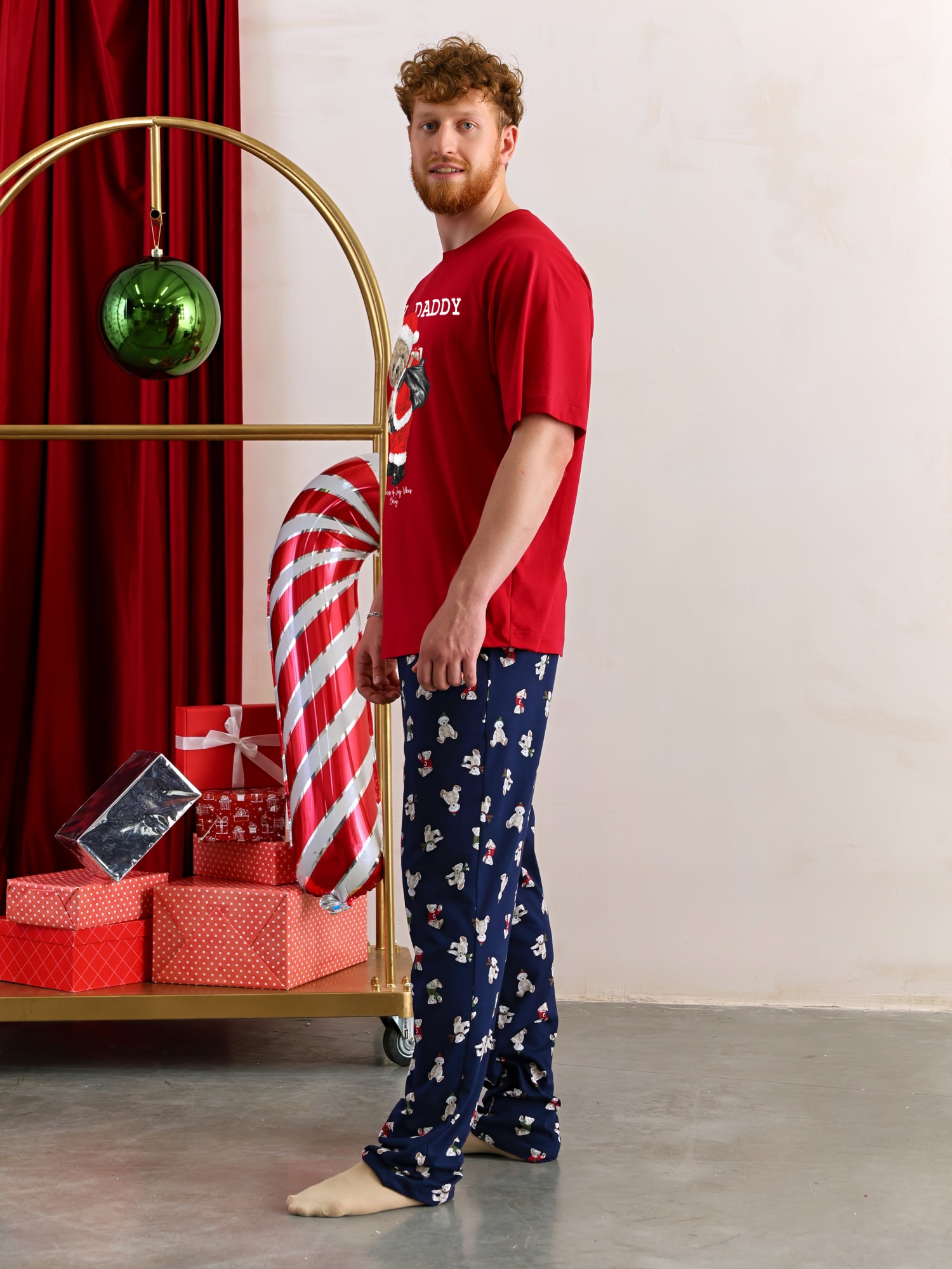 Костюм мужской из трикотажного полотна "кулирка" в комбинации двух видов: гладкокрашеного и набивного с тематическим рисунком, состоящий из футболки и брюк. Футболка из гладкокрашеного полотнас рукавами "реглан" длиной до локтя, горловиной овальной формы, обработанной втачной планкой и отделочной строчкой. В центре переда - принт, выполненгный в технике шелкографии. Брюки из полотна с набивным рисунком длинные, прямые, на притачном поясе с эластичной тесьмой внутри и карманами в боковыых швах.