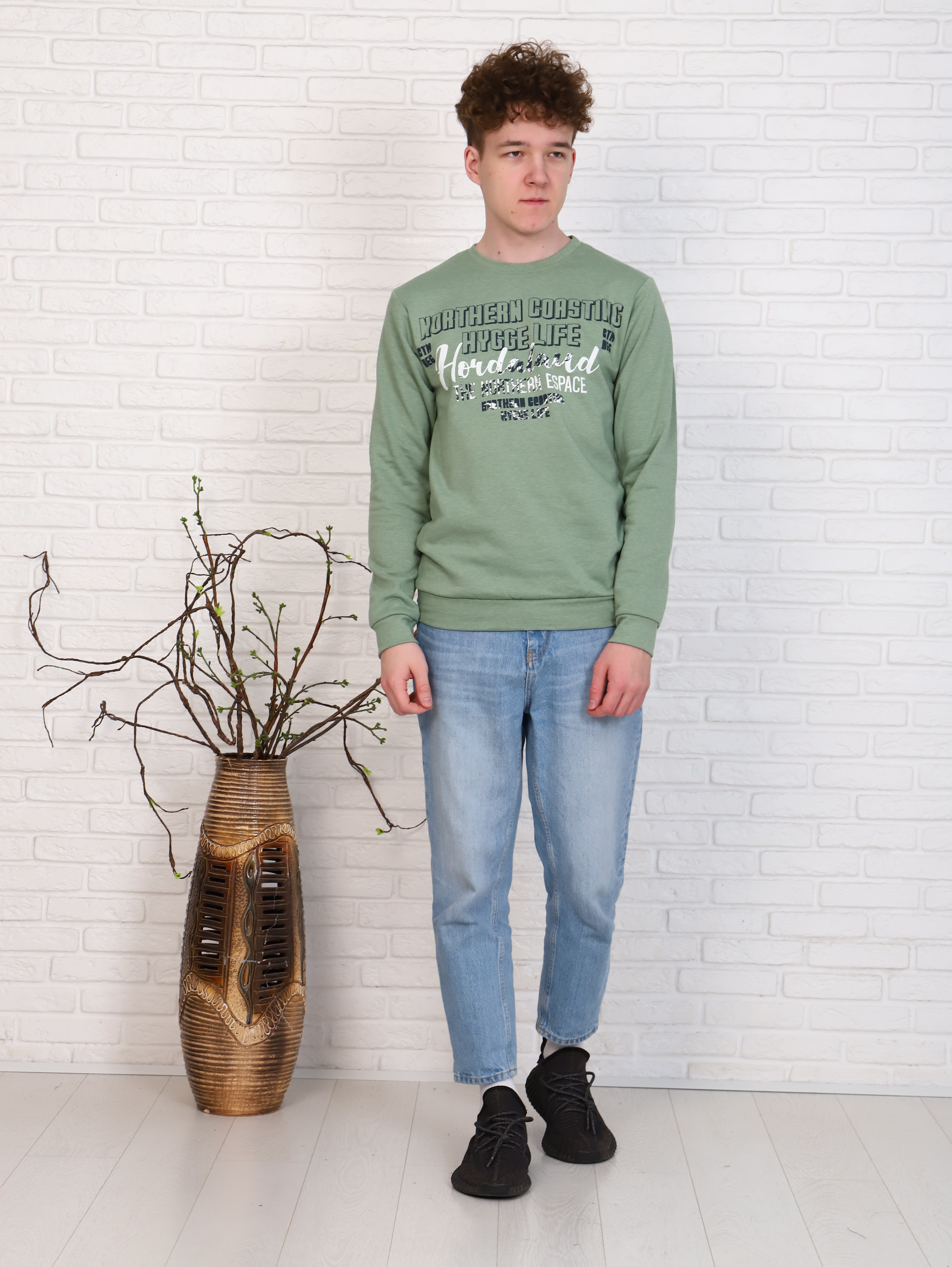Стильная мужская толстовка-свитшот из облегчённого футера с микроначёсом. Классический округлый вырез горловины, рукава и низ изделия на манжетах, на полочке печатный принт. Модель отлично смотрится и с джинсами, и с классическими брюками. Идеальный вариант на каждый день.