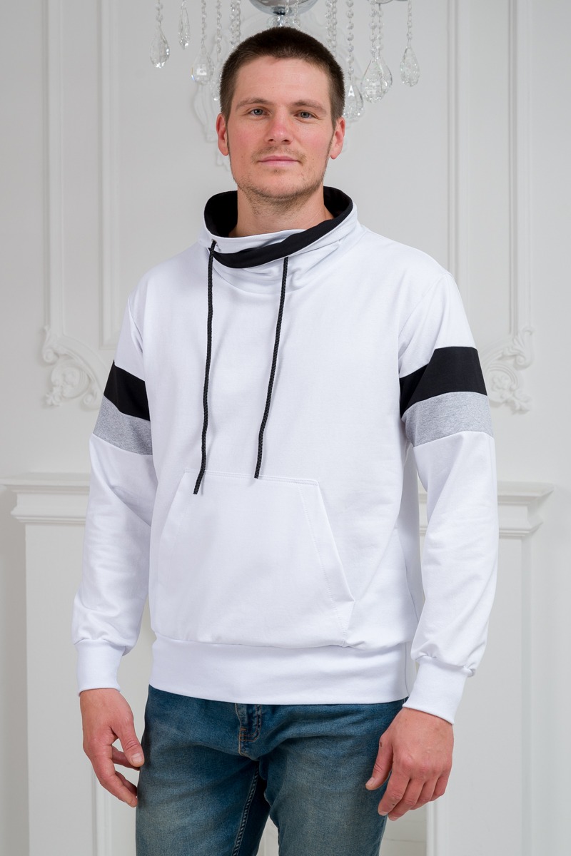 Толстовка мужская из футера Оскар белый макс из комбинированной ткани. Воротник-хомут, карман-кенгуру.