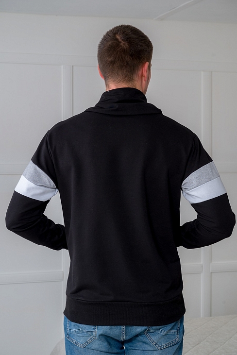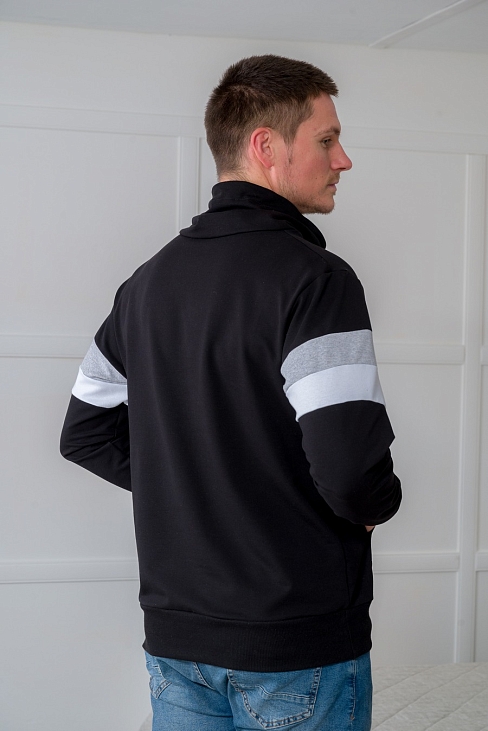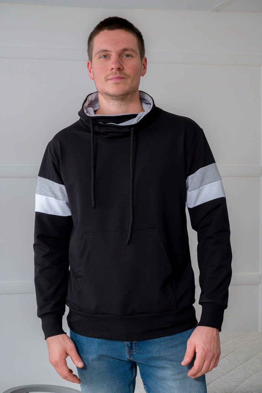 Толстовка мужская из футера Оскар черный из комбинированной ткани. Воротник-хомут, карман-кенгуру.