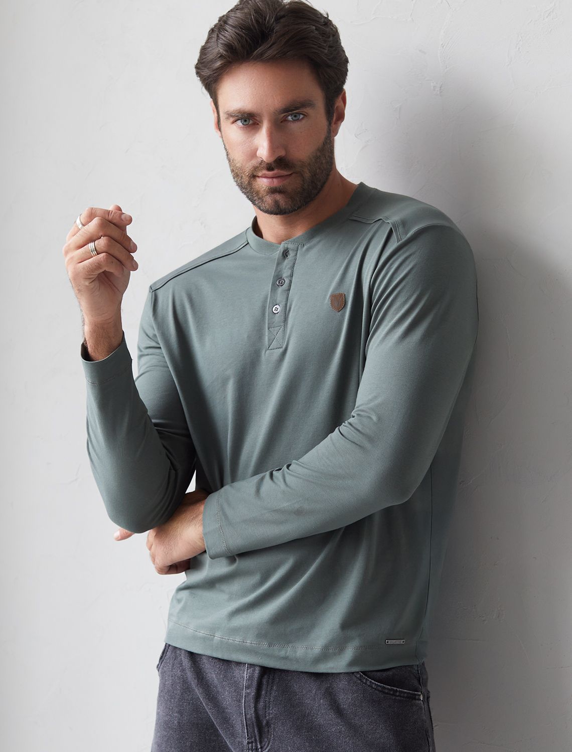 Тонкий лонгслив с круглым воротом на пуговицах из премиального хлопка с эластаном U49.053 т.оливковый