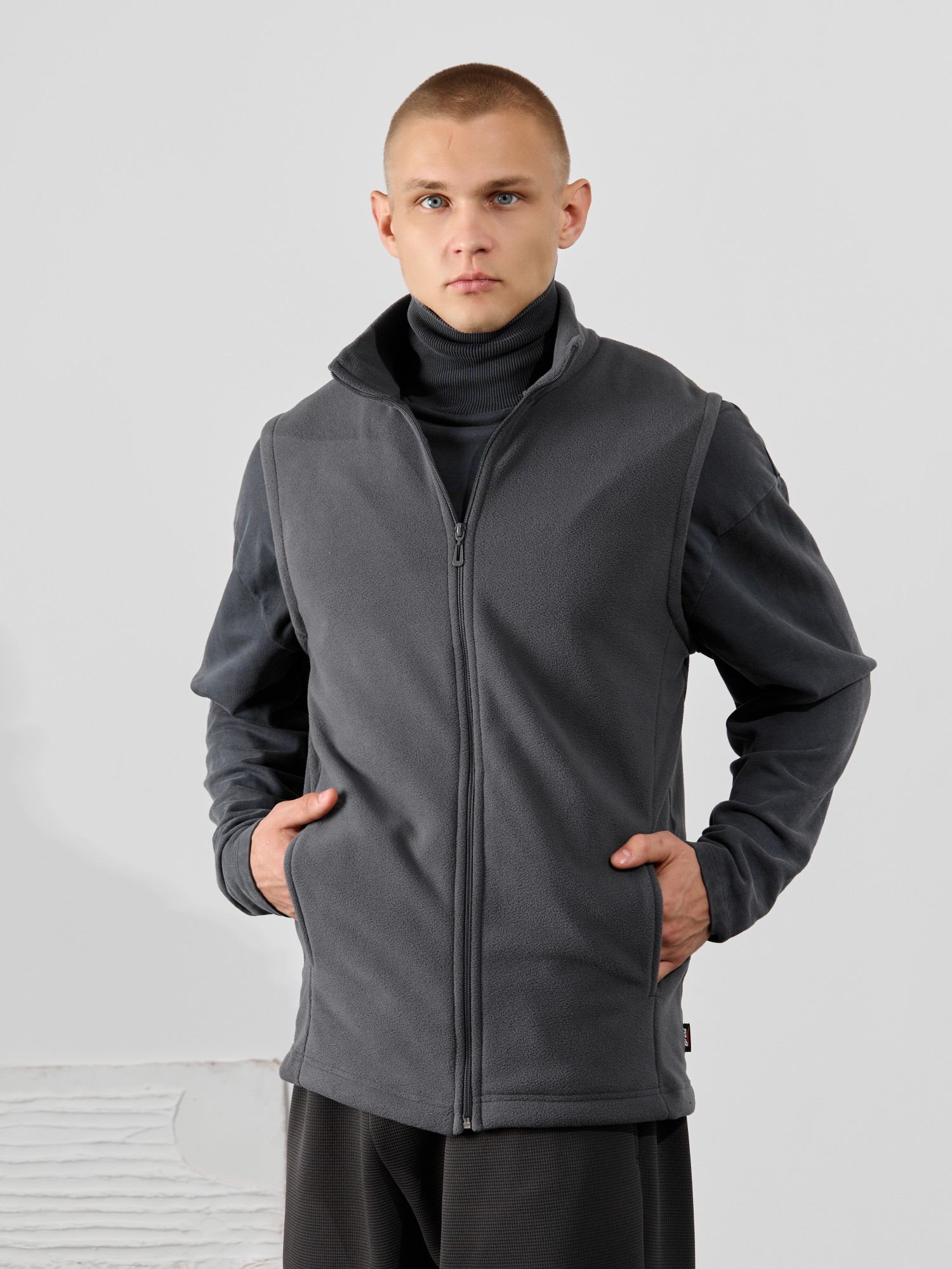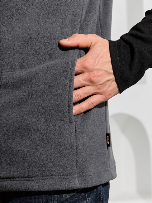 Жилет мужской из флиса, прилегающего силуэта, с воротником-стойкой , центральной боротовой застежкой на тесьму "молния" и вертикальными рельефами  на полочках, в швах которых обработаны карманы. Проймы и низ изделия обработаны подгибкой. В нижней части левого бокового шва вставлен небольшой декоративный элемент из репсовой ленты.