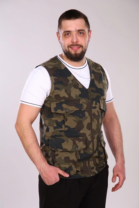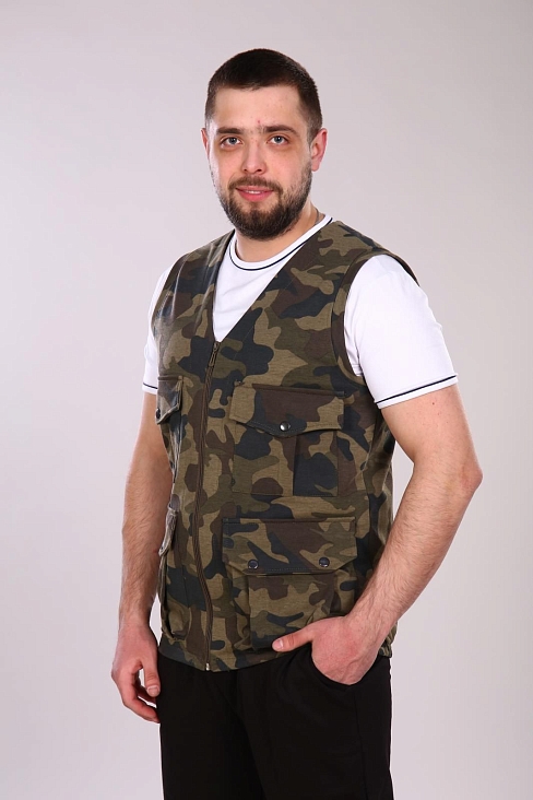 Удобный мужской жилет Ковбой на молнии с двумя накладными нагрудными карманами с клапанами и двумя объёмными накладными карманами-портфелями с клапанами. Карманы застёгиваются на кнопки. Пройма жилета обработана обтачкой.