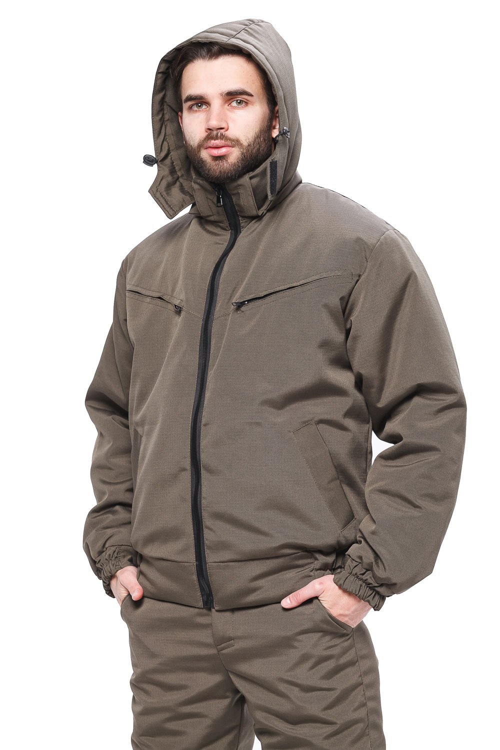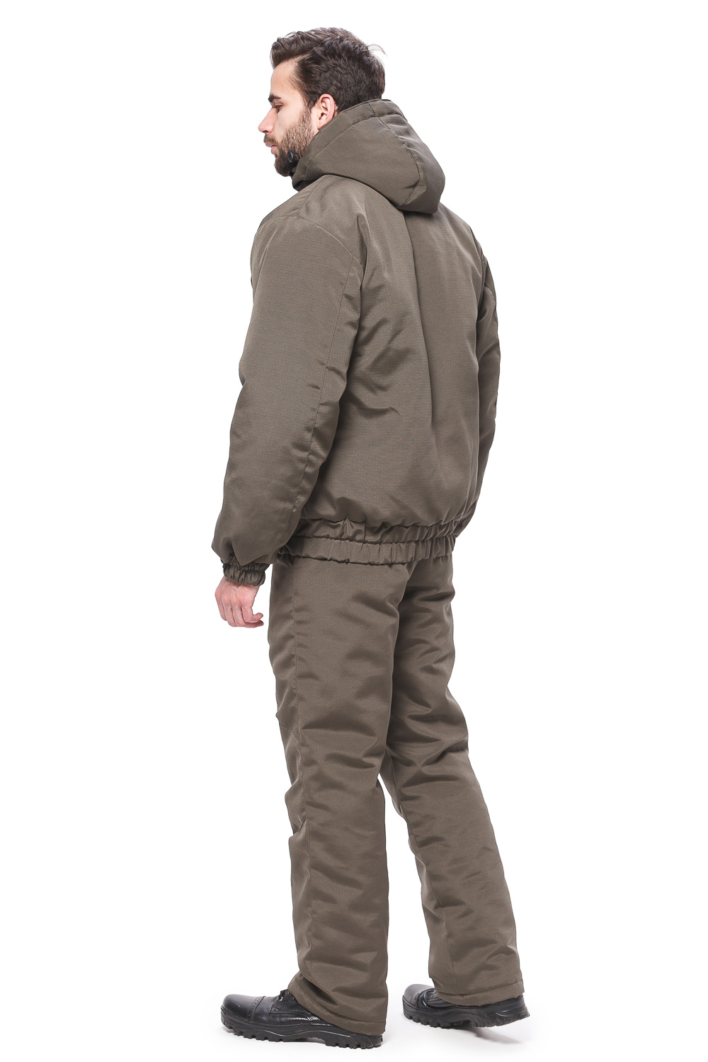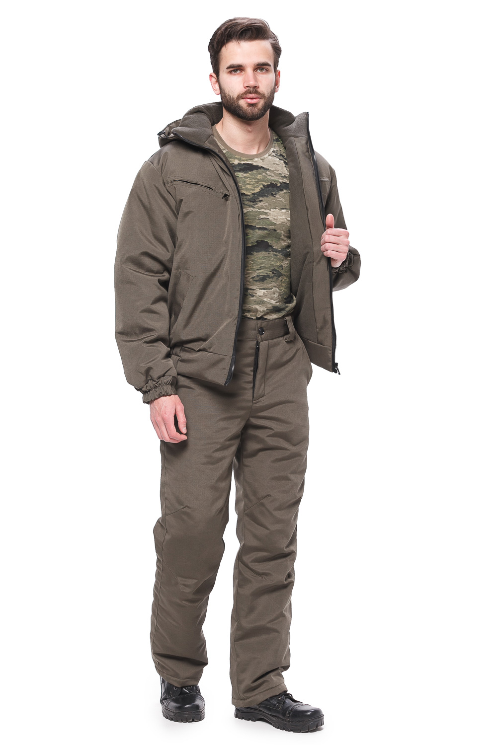 Куртка укороченная, с воротником - стойкой, центральной бортовой застёжкой на молнию, съёмным капюшоном.Полочки с отрезными кокетками,в швах которых обработаны карманы, застёгивающиеся на молнию и двумя нижними прорезными карманами в листочку.Спинка цельнокроёная.Рукава втачные двух частей, с манжетами, притаченными по низу,собранные на резинку.Куртка на притачном поясе,собранном на резинку.Капюшон съёмный, по лицевому вырезу стягивается шнуром,закреплённым фиксаторами.      Брюки с гульфом на молнии, на притачном поясе со шлёвками, собранном на резинку.На передних половинках обработаны два боковых кармана и застрочены вытачки.li>Ткань: Рип-стоп Состав ткани: 80%ПЭ, 20%ХЛ Модель: Альфа Подкладка: Флис Температурный режим: от -10 до +5 гр.С Сезон: Демисезон Тип: Костюм Цвет: Хаки Нешуршащая: Да Дышащая: Да Ветрозащитная: Да Назначение: Охота, рыбалка, туризм