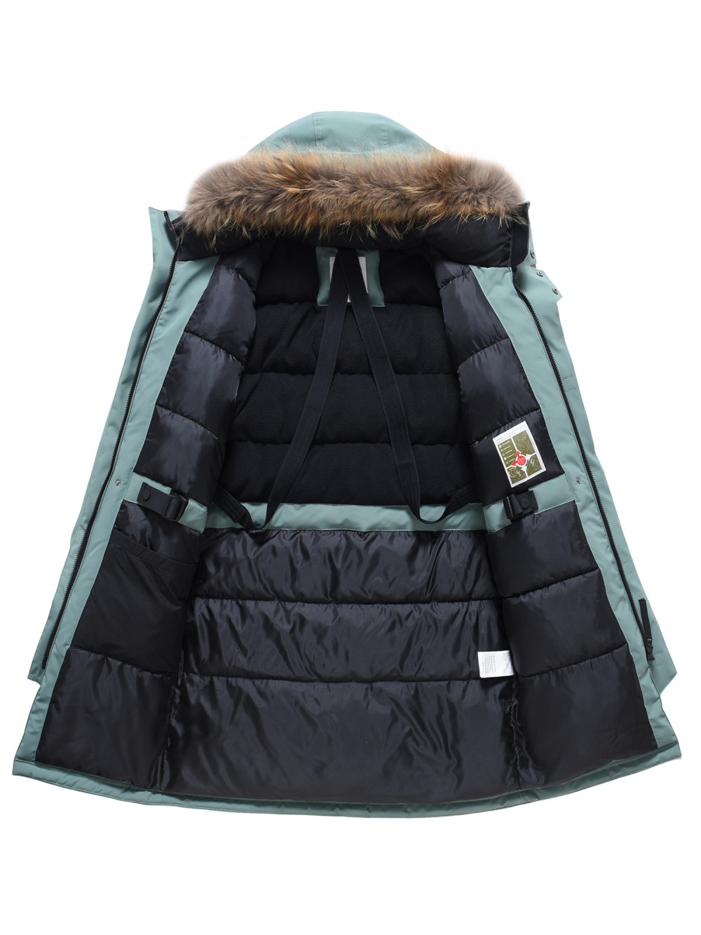 Внутренняя подкладка из овчины, полиэстера и флиса делает модель особенно тёплой и приятной в носке. Капюшон несъёмный, он плотно прилегает и защищает голову в непогоду, а роскошная опушка из натурального меха енота легко снимается благодаря молнии. Стояче-отложной воротник дополнительно прикрывает шею и создаёт ощущение уюта даже без шарфа.