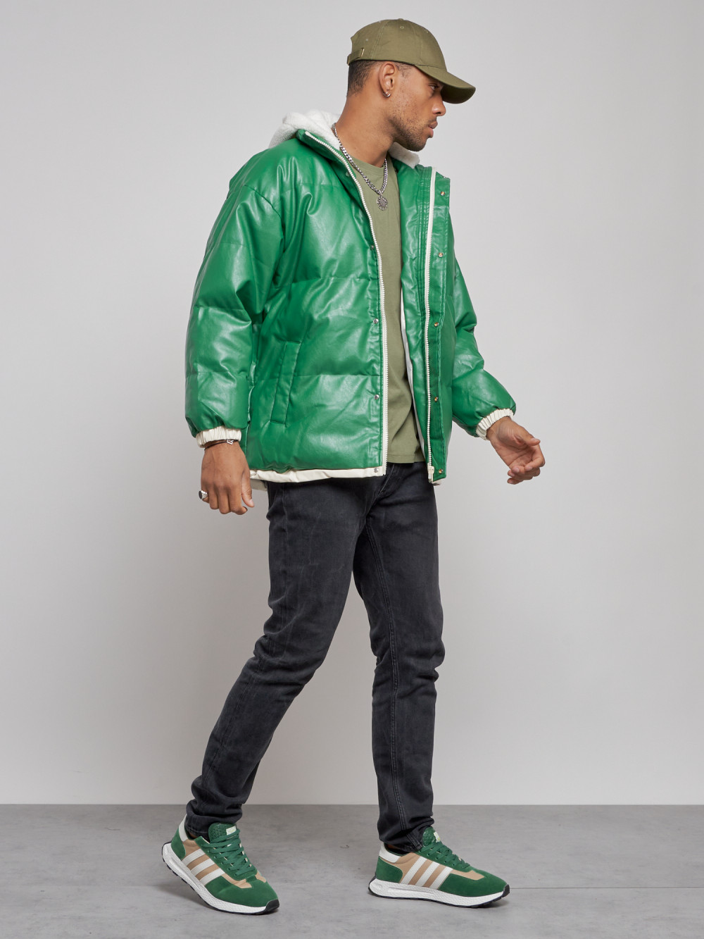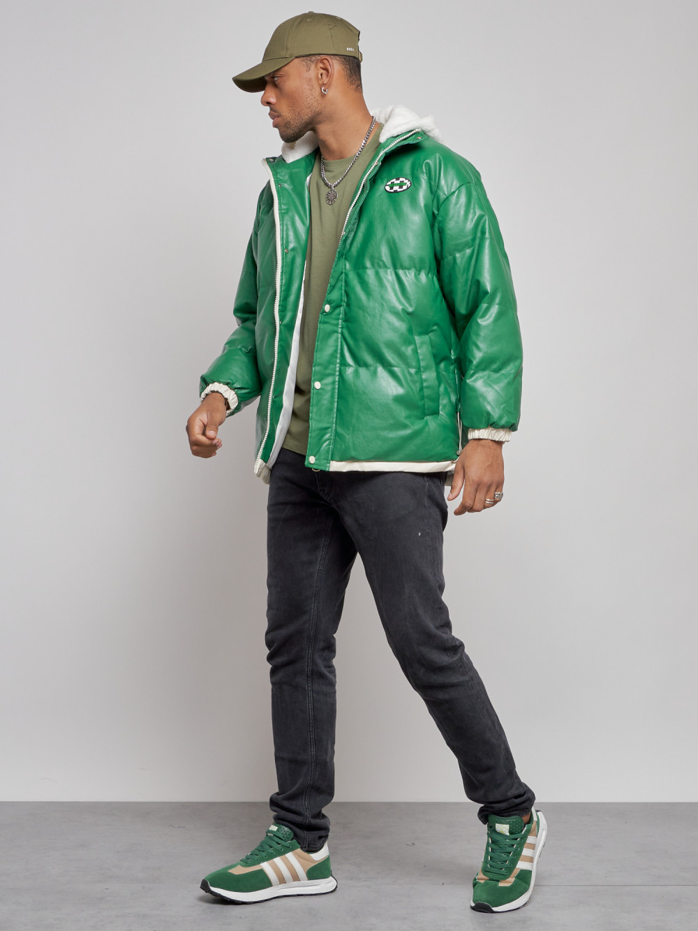 Куртка из экокожи мужская с плюшевым капюшон зеленого цвета 28132Z