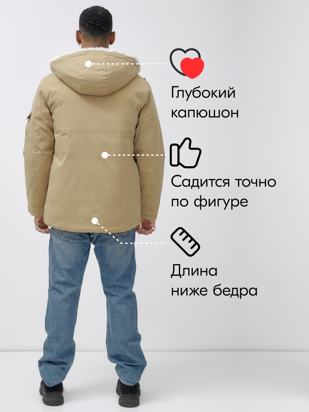- Длина ниже бедра: Парка надежно закрывает спину и защищает от пронизывающего ветра, обеспечивая максимальный комфорт в холодные дни.