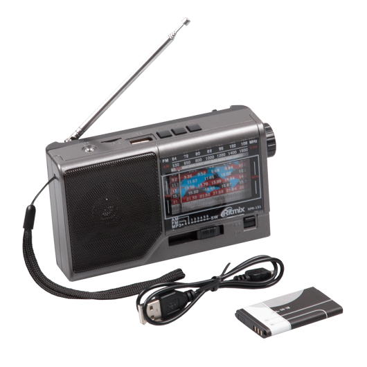 Ritmix RPR-151 – портативный восьмидиапазонный радиоприёмник, охватывающий в том числе и MP3-файлов с карт памяти microSD или USB-флэшки. Устройство снабжено встроенным аккумулятором.