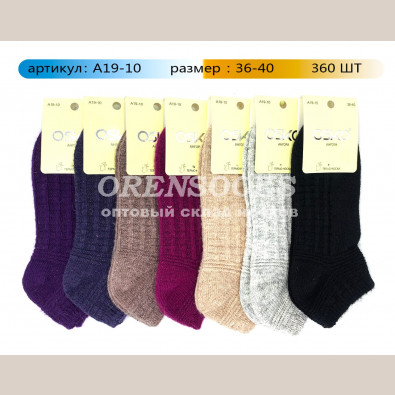 Артикул: A1910 Производитель: OSK..показатьO Состав: 50% Ангора 35% Шерсть 10% Полиамид 5% Спандекс Количество в упаковке: 12 парOSKO Термо носки женские, укороченные,50% ангора, 35% шерстьO Ассорти