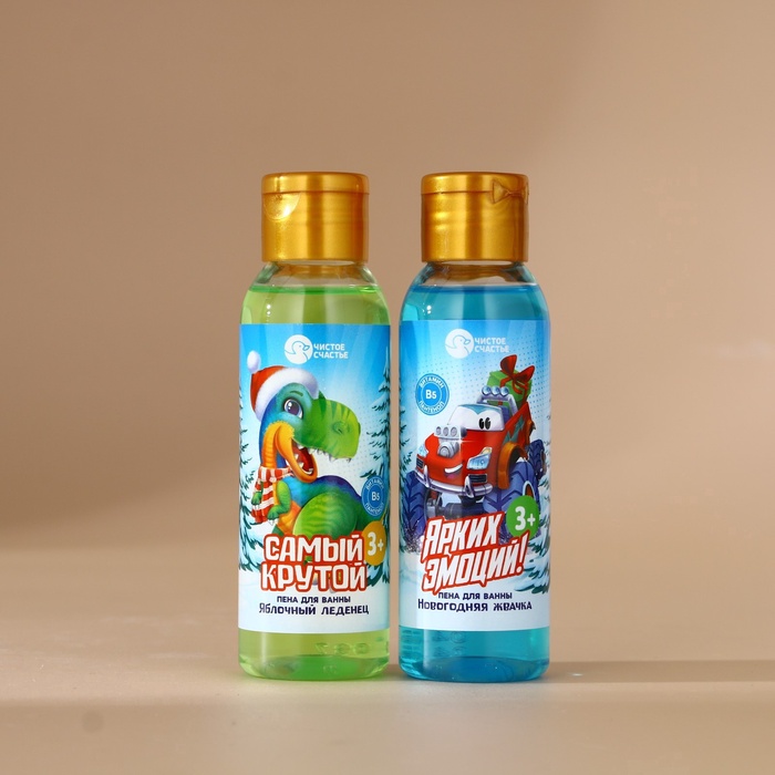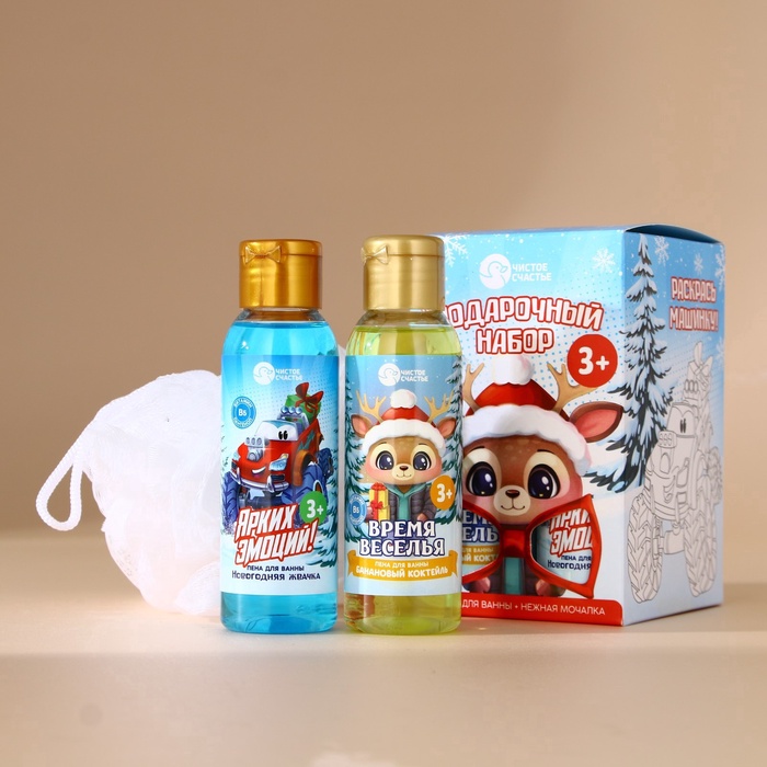 Подарочный набор новогодний детский «Ярких эмоций!»: пена для ванны 2×100 мл и мочалка для тела, Чистое счастье