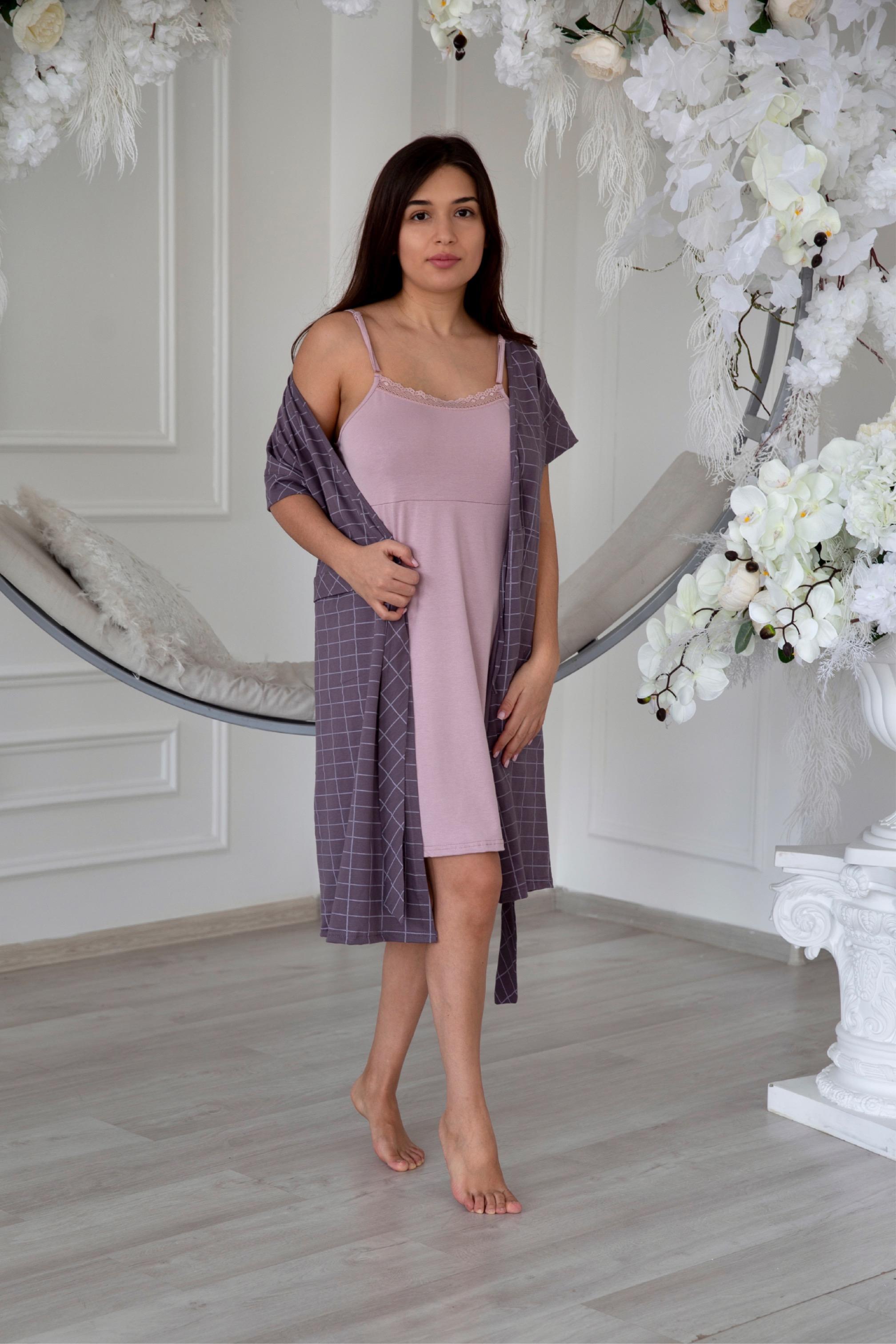 Как выглядит идеальный комплект для женщины? Ткань, приятная к телу, немного кружев для настроения, комфортная длина и актуальная расцветка. Это конечно же комплект Макиато. Хлопок с добавлением вискозы и лайкры отлично тянется, а значит подойдет для любого типа фигуры. Ночная сорочка нежного розового цвета на бретелях и свободный, легкий халат в клетку. Добавьте в повседневность стиля и комфорта подарите себе или подруге комплект Макиато.