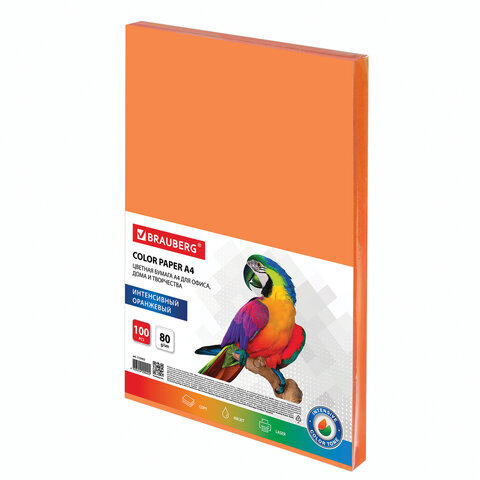 Бумага цветная BRAUBERG, А4, 80 г/м2, 100 л., интенсив, оранжевая, для офисной техники, 112452