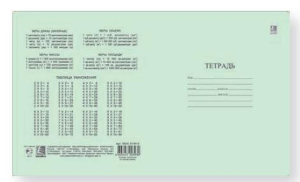 Тетрадь школьная с классической зеленой обложкой. Внутренний блок из 24 листов плотностью 60 г/м2 из офсетной бумаги имеет линовку в клетку с полями. Обложка изготовлена из офсетной тонированной бумаги плотностью 80 г/м2. Скрепка надежно скрепляет листы между собой. На оборотной стороне тетради таблица умножения. Тетрадь подойдет для занятий любому школьнику, используется для письма шариковыми, гелевыми и капиллярными ручками.