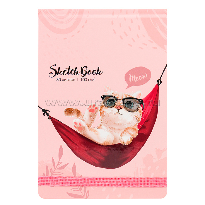Скетчбук А5, 80л, "Котик в гамаке" 7БЦ, переплет сверху, мат. ламин. лак, резинка