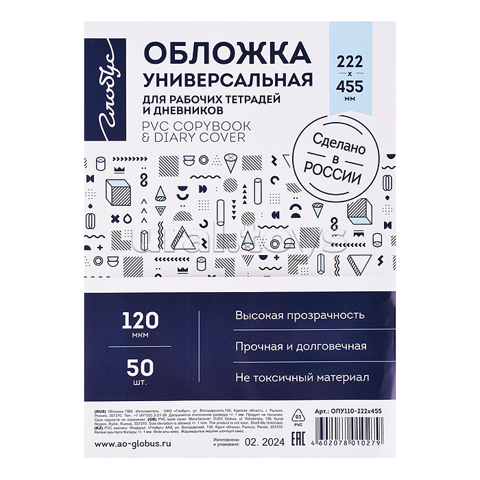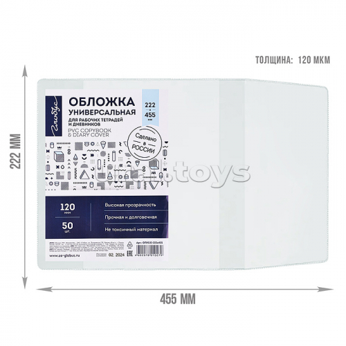 Обложка 222 х 455 универсальная для рабочих тетрадей и дневников, прозрачная, 120 мкм 50 шт.