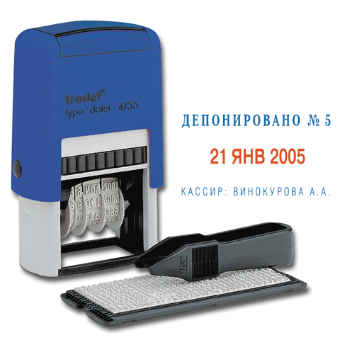 Позволяет произвести оттиск даты и двух строк текста. Дата изменяется вращением колесика. Текст набирается из кассы шрифта, входящей в комплект.