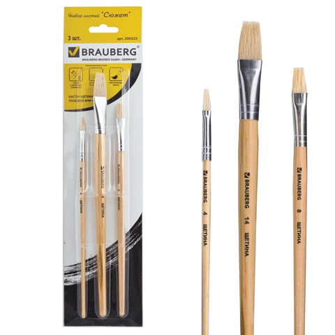 Кисти BRAUBERG, НАБОР 3шт., (из щетины плоская № 4,8,14), блистер, 200223