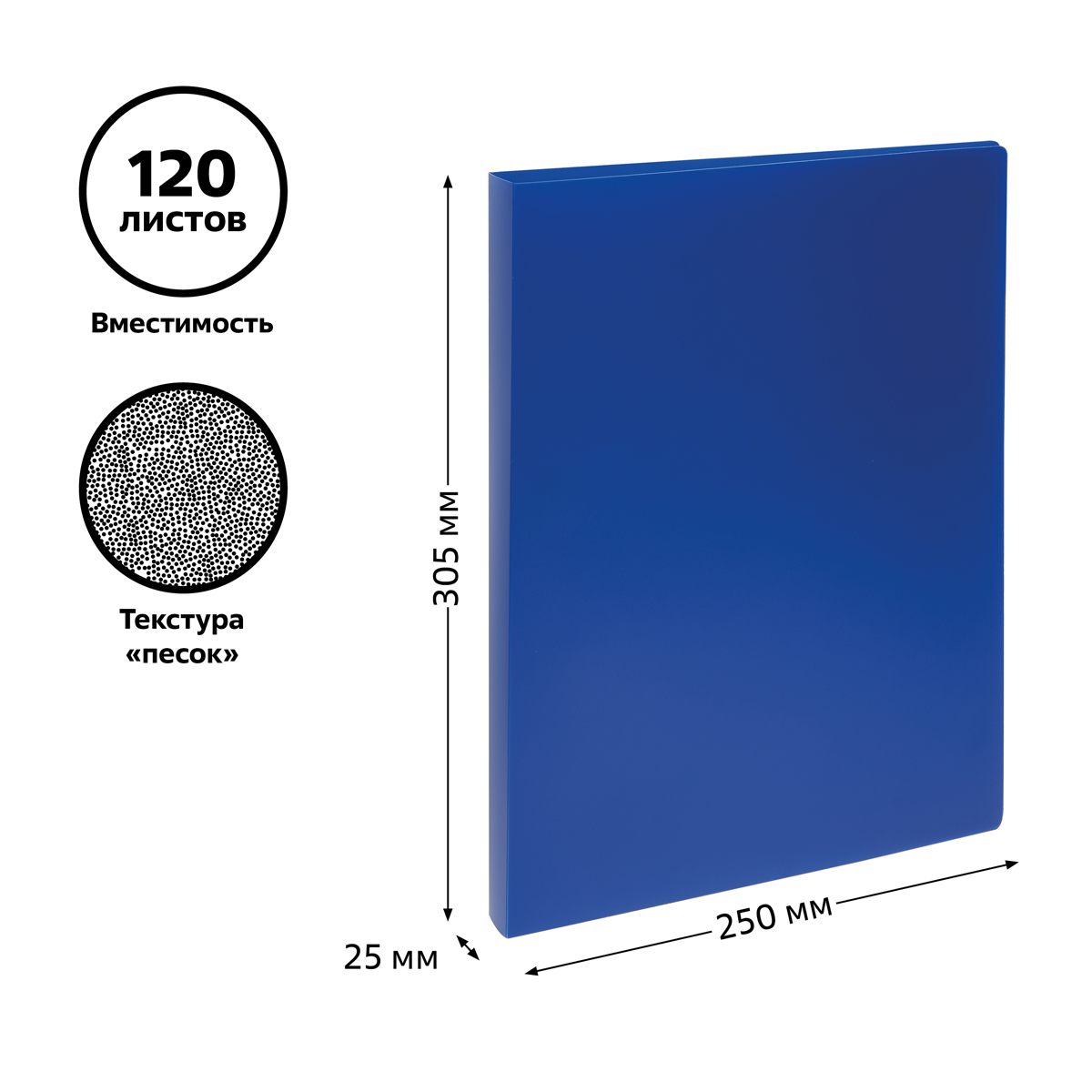 Папка на 2 кольцах «СТАММ» предназначена для хранения перфорированных документов формата А4. Цвет папки – синий. Изготовлена из качественного полипропилена плотностью 500 мкм с текстурой «песок». Размер изделия составляет 250*305 мм. Ширина корешка 25 мм позволяет вмещать в папку до 120 листов. Кольцевой механизм, состоящий из 2 колец диаметром 16 мм, надежно держит документы. Папка упакована в индивидуальный пакет.