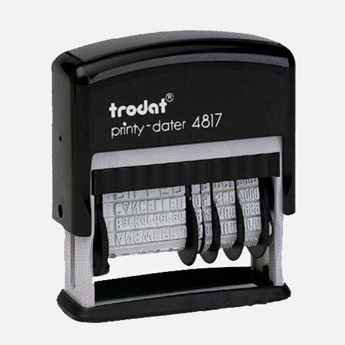 Позволяет проставить 12 бухгалтерских терминов: КОПИЯ, АННУЛИРОВАНО, ДЕПОНИРОВАНО, ПОГАШЕНО, ОПЛАЧЕНО, ПОЛУЧЕНО, ПРОВЕРЕНО, СРОЧНО, ОРИГИНАЛ, ОБРАЗЕЦ, ВХ. №___, ИСХ. №___. Изменение оттиска производится вращением колесика.