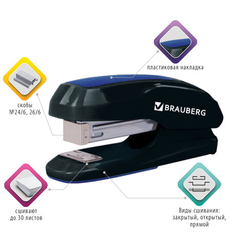 Настольный степлер с металлическим механизмом BRAUBERG "Extra" незаменим в работе с большим объемом документов. Полезный аксессуар, который можно встретить на столе не только школьников и студентов, но и офисных работников, а также предпринимателей. Способен скрепить до 30 листов. Подходящий размер скоб №24/6, 26/6. Глубина закладки бумаги - 55 мм. Виды сшивания: закрытый, открытый и прямой. Резиновая накладка предотвращает скольжение степлера по столу. Корпус изготовлен из пластика. За счет компактных размеров не займет на рабочем столе много места, а классические цвета и дизайн будут отлично дополнять любой интерьер. Высокое качество степлера BRAUBERG "Extra" по доступной цене надолго станет незаменимым помощником при работе с документацией.