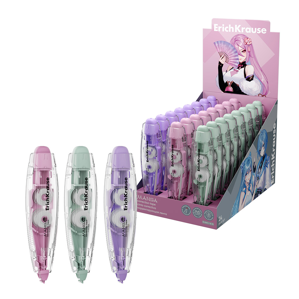 Корректирующая лента ErichKrause Spin Manga, с автоматической фиксацией аппликатора, 5мм х 6м, ассорти (в дисплее по 18 шт.)