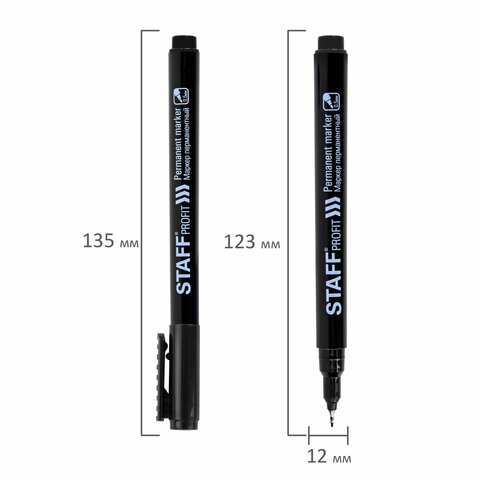 Маркер перманентный STAFF "Profit PM-105" отлично подходит для повседневного использования. Предназначен для письма на любой поверхности: бумага, полиэтилен, дерево, стекло, металл, натуральная кожа, ткань, камень, плитка. Маркер перманентный черного цвета обладает тонким круглым корпусом, диаметр которого 12 мм и длина 135 мм. Толщина линии письма - 0,5 мм. Особая нестираемая основа перманентного маркера обеспечивает такие качества, как стойкость к воздействию воды, низких и высоких температур. Благодаря спиртовой основе чернила быстро сохнут и не размазываются. Износостойкий наконечник устойчив к повреждениям и обеспечивает экономный расход чернил. Изделие не перезаправляется. Плотный колпачок с клипом предотвращает высыхание наконечника и чернил. Цвет корпуса и колпачка соответствует цвету чернил.