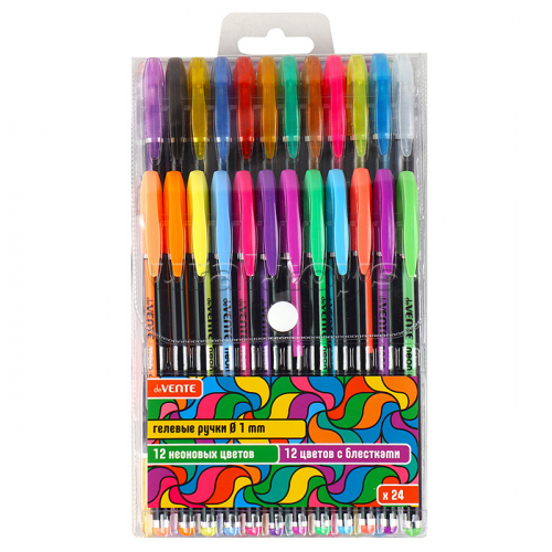 Набор ручек гелевых "Neon Black" 24 цвета, d=1 мм, черный корпус с цветными полосами, сменный стержень, в пластиковом блистере