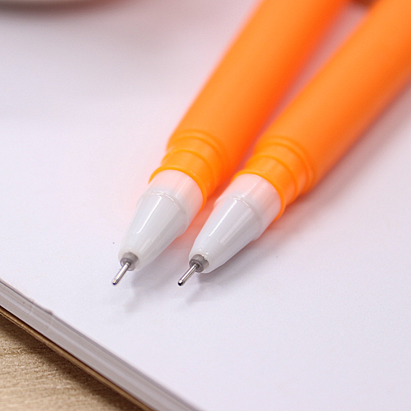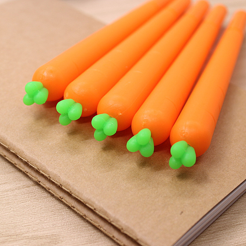 Канцелярская ручка из оранжевого пластика с черной гелевой пастой выполнена в виде морковки и выглядит совсем как та, которой пользовались герои мультфильма "Зверополис".