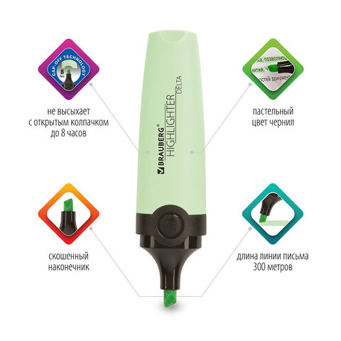 Текстовыделитель BRAUBERG "DELTA PASTEL" предназначен для выделения текста на бумаге любого типа, включая факс-бумагу. Текстовыделитель мятного цвета имеет овальную форму корпуса, диаметр которого 25 мм. Особый пастельный оттенок создает мягкие переходы и позволяет равномерно выделить текст. Скошенный наконечник имеет толщину линии письма от 1 до 5 мм, что обеспечивает удобство при работе с текстом, напечатанным мелким шрифтом, или таблицами. Благодаря особой водной основе чернил текстовыделитель не высыхает без колпачка в течение 8 часов. Текстовыделитель обладает экономным расходом чернил, при этом длина линии письма достигает 300 метров. Чернила быстро впитываются и тем самым предотвращают размазывание в процессе использования. Цвет колпачка и корпуса текстовыделителя соответствует цвету чернил.