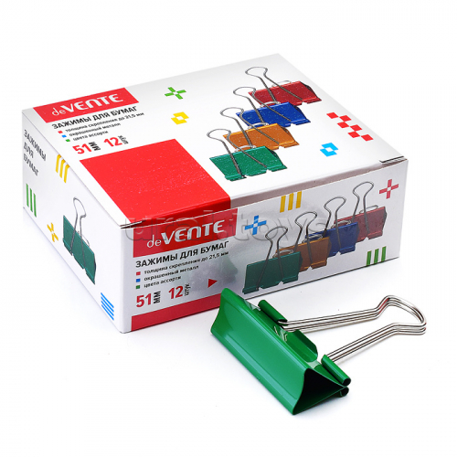 Зажим для бумаг металлический (51 мм) толщина скрепления до 21,5 мм, цветной ассорти, 12 шт в картонной коробке