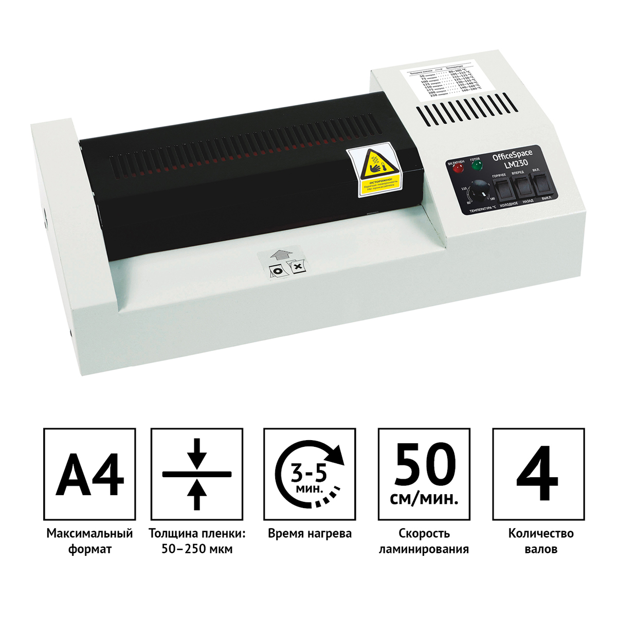 Ламинатор OfficeSpace LM230, А4, 50-250мкм, 4 вала, скорость 50см/мин, метал. корпус 335255