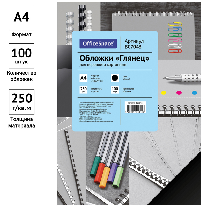 Обложка А4 OfficeSpace "Глянец" 250г/кв.м, черный картон, 100л. 222483