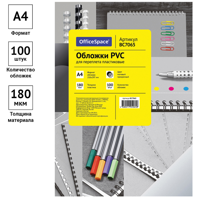Обложка А4 OfficeSpace "PVC" 180мкм, прозрачный матовый пластик, 100л. 222504