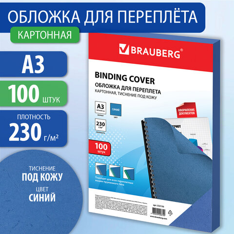 Обложки картонные для переплета, А3, КОМПЛЕКТ 100 шт., тиснение под кожу, 230 г/м2, синие, BRAUBERG, 532156