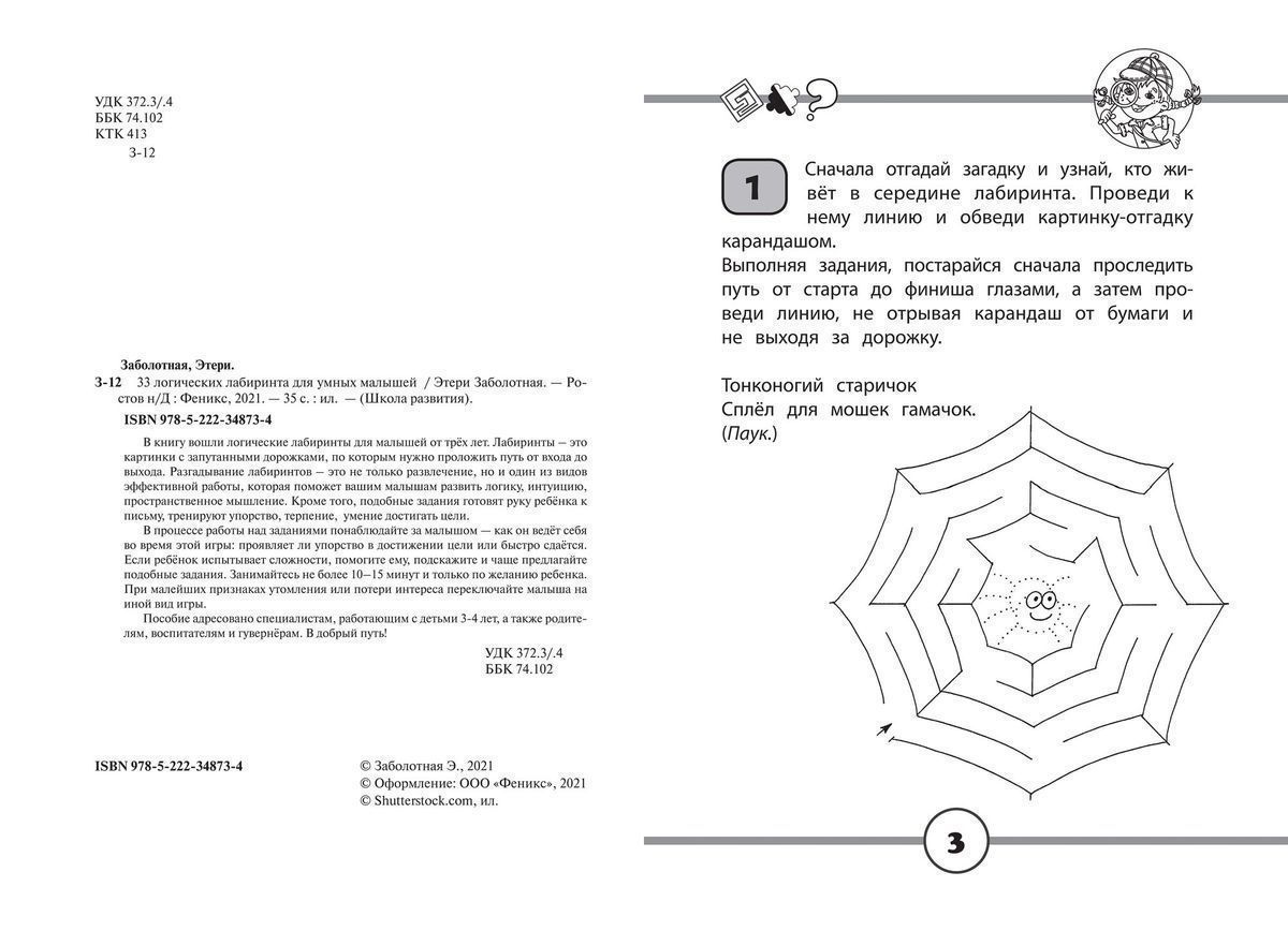 В книгу вошли логические лабиринты для малышей от трех лет. Лабиринты - это картинки с запутанными дорожками, по которым нужно проложить путь от входа до выхода. Разгадывание лабиринтов - это не только развлечение, но и один из видов эффективной работы, которая поможет вашим малышам развить логику, интуицию, пространственное мышление. Кроме того, подобные задания готовят руку ребёнка к письму, тренируют упорство, терпение, умение достигать цели.